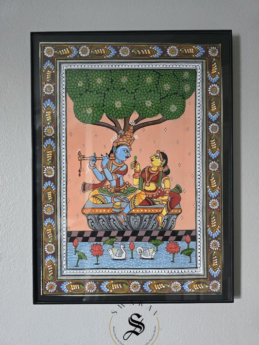Handmade Pattachitra painting of Radha Krishna on Silk canvas. Size 8 by 12 inch.