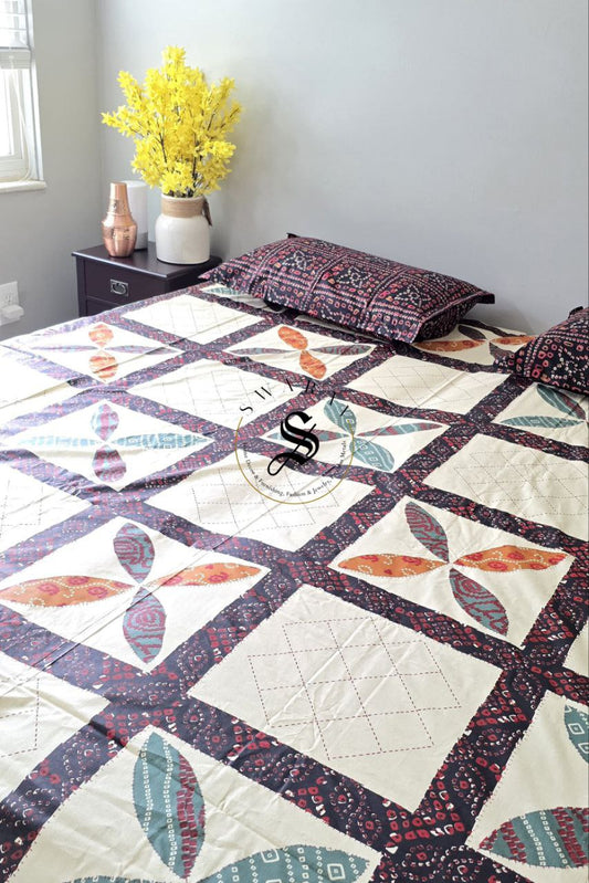 100% cotton Katha stitch and Applique design PRINTED Jaipur King Size flat sheet Set - 108 by 108 inch.