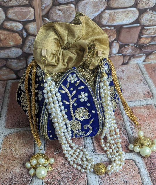 Lotus Potli - Draw string pattern with beads handle -Dark Velvette Blue.