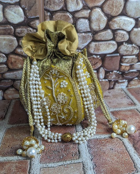Lotus Potli - Draw string pattern with beads handle - Mustard Yellow.