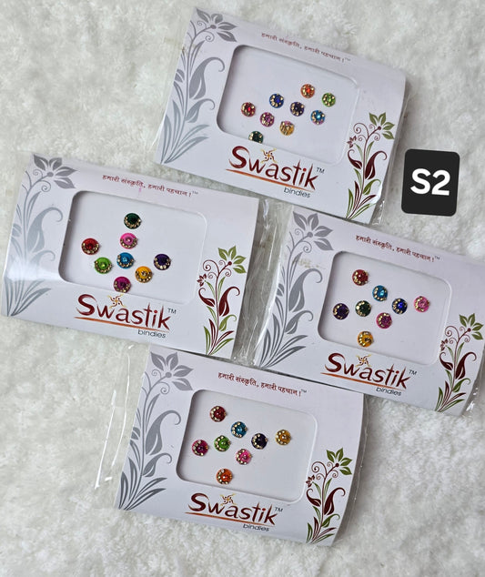 Swastik - Pack of 4 fancy Bindi, assorted size, shape and colors in each pack.