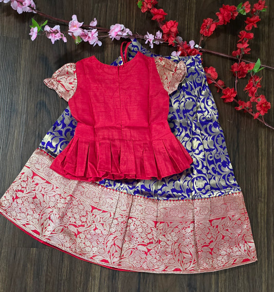 Zari woven cotton blend Pavadai set ( Ghaghra Blouse )for Baby Girl in Red and Royal blue combination.