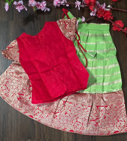 Zari woven cotton blend Pavadai set ( Ghaghra Blouse )for Baby Girl in parrot green and red combination.