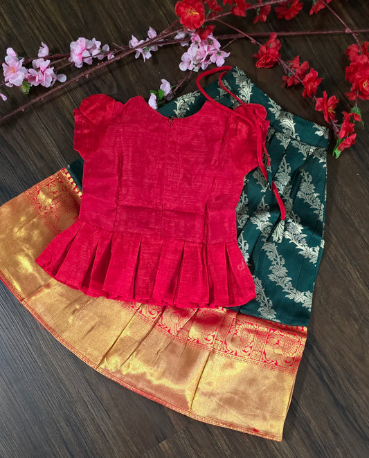 Zari woven cotton blend Pavadai set ( Ghaghra Blouse )for Baby Girl in Bottle green and red combination.