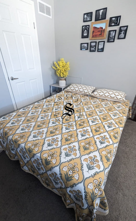 Jaipur Pure Cotton Queen Size Bedsheet Set - 102 by 88 inch. Mustard Yellow Bouquet print.