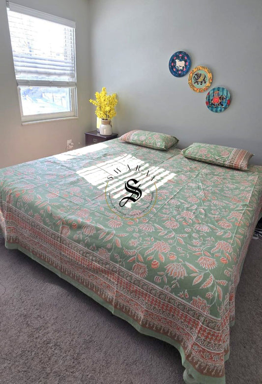 South Cotton thick fabric Jumbo King Size Bedsheet Set - 108 by 108 inch. Mint green floral print.