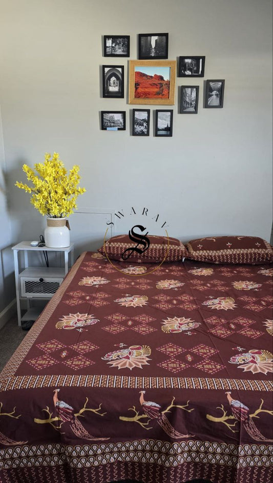 Jaipur Pure Cotton Queen Size Flat sheet Set - 102 by 88 inch. Maroon Base with peacock design.