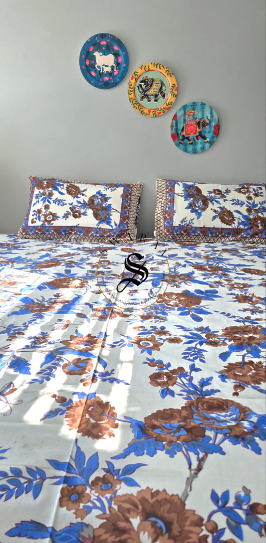 Jaipur Pure Cotton Jumbo King Size Bedsheet Set - 108 by 108 inch. Floral print on Ocean Blue.