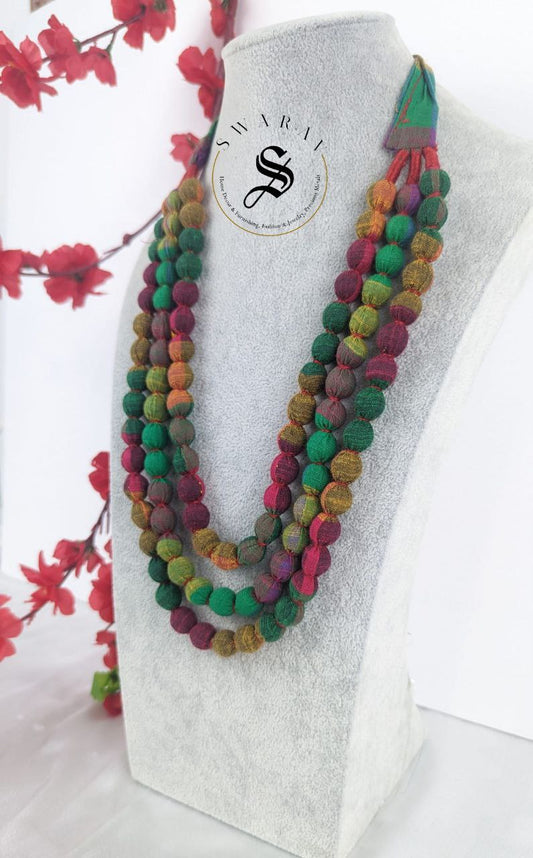 Hand made Fabric ball 3 layer Haar/ long necklace - Multi color - Design Code - D1