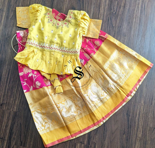 Jacquard silk Pavadai set ( Ghaghra Blouse )for Baby Girl. Color- Pink. Age - 6