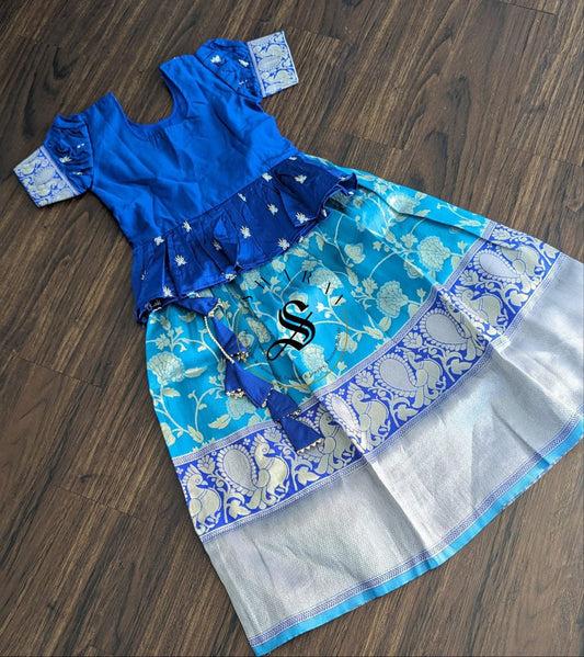 Zari woven cotton blend Pavadai set ( Ghaghra Blouse )for Baby Girl . Royal Blue. Age 6.