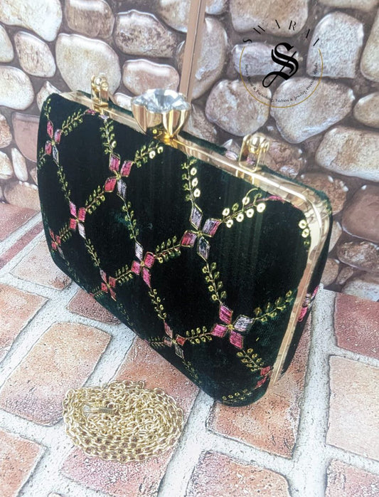Sequence and embroidered Party Clutch - Size : 9 by 5 by 2 inches. Color - Leather Black.