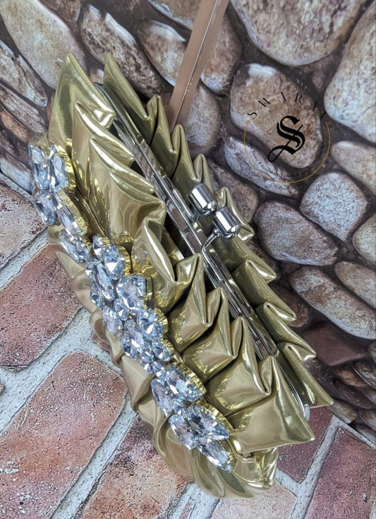 Women's Pleated crystal stone broach Party clutch. Size - 9 by 5 inch. Color - Golden.