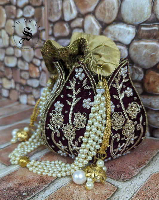 Lotus Potli - Draw string pattern with beads handle -Dark Maroon