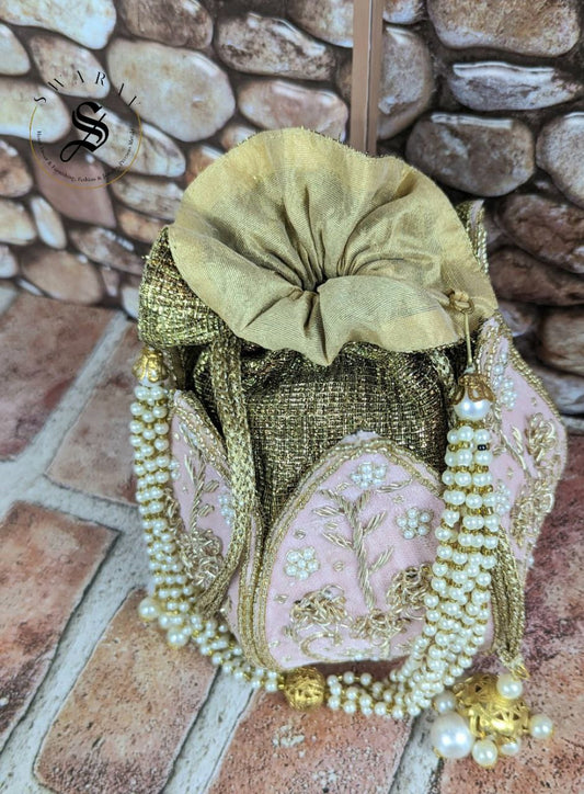 Lotus Potli - Draw string pattern with beads handle - Pastel pink.