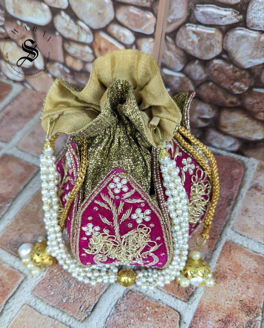 Lotus Potli - Draw string pattern with beads handle - Magenta Pink