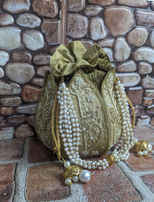 Lotus Potli - Draw string pattern with beads handle - Beige