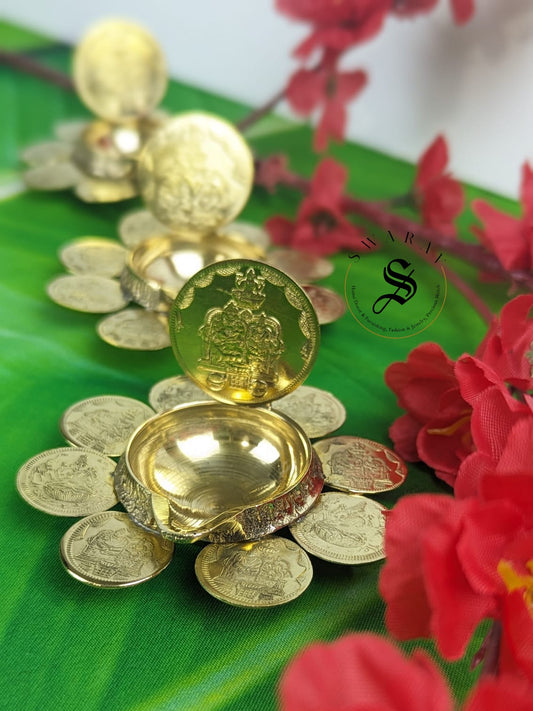 Pure Brass Goddesses Lakshmi kasu or coin Deepam/Diya/ Deepak / Oil lamp - Pack of 3.