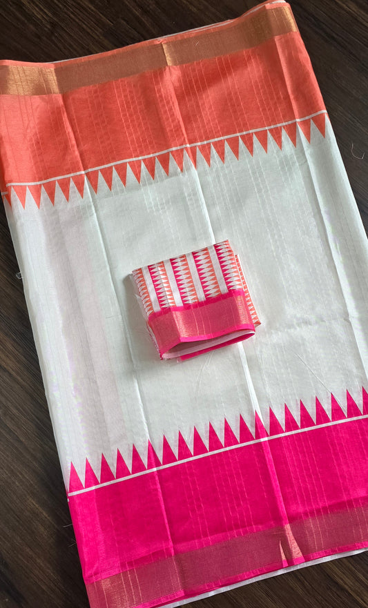 Semi Tussar temple style Ganga jamuna border saree with unstitched blouse. Orange and pink.
