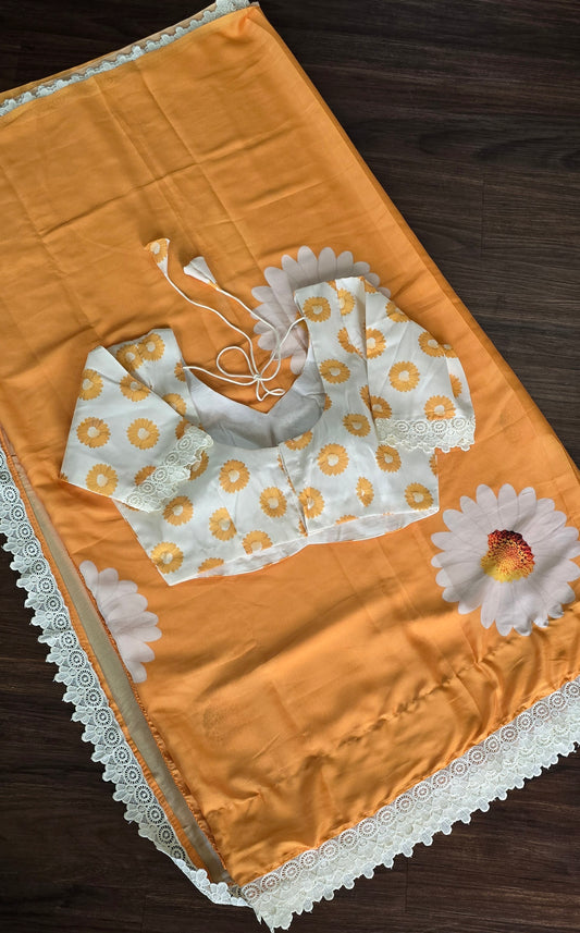 Premium orange Crape silk saree with Gorgeous sunflower print and stitched blouse.