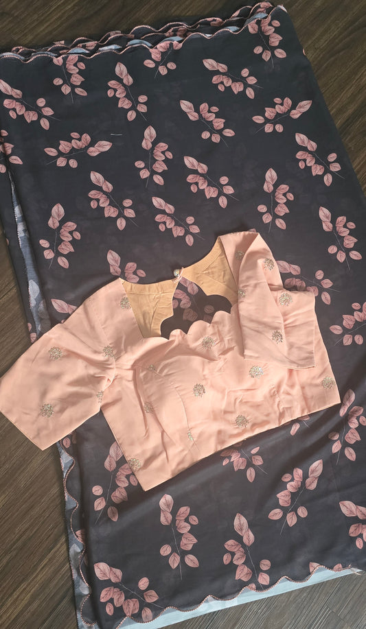soft weightless Chiffon saree with black base and skin color leaves all over. Comes with stitched blouse.