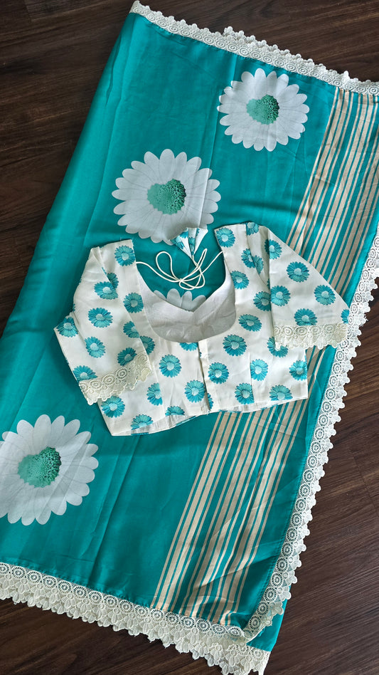Premium Ramagreen Crape silk saree with Gorgeous sunflower print and stitched blouse.