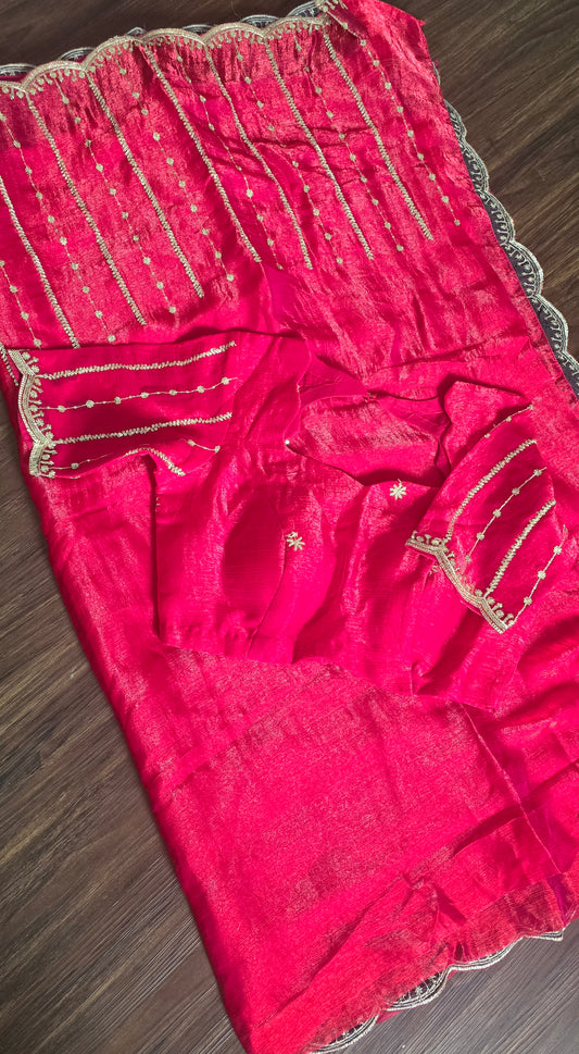 Ultra soft Fendy silk Party wear Saree in Red with sequence work on pallu and body with stitched blouse.