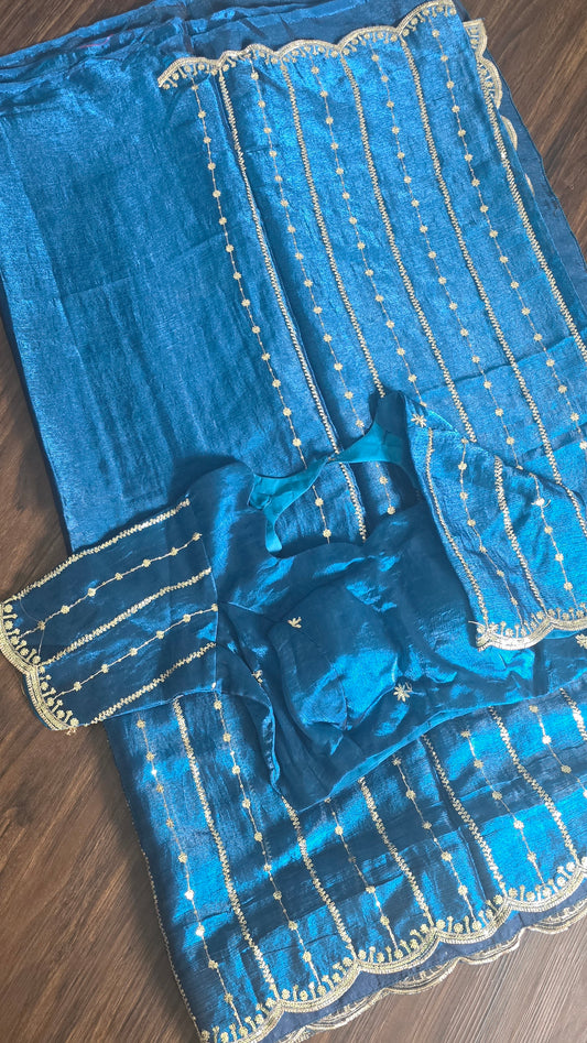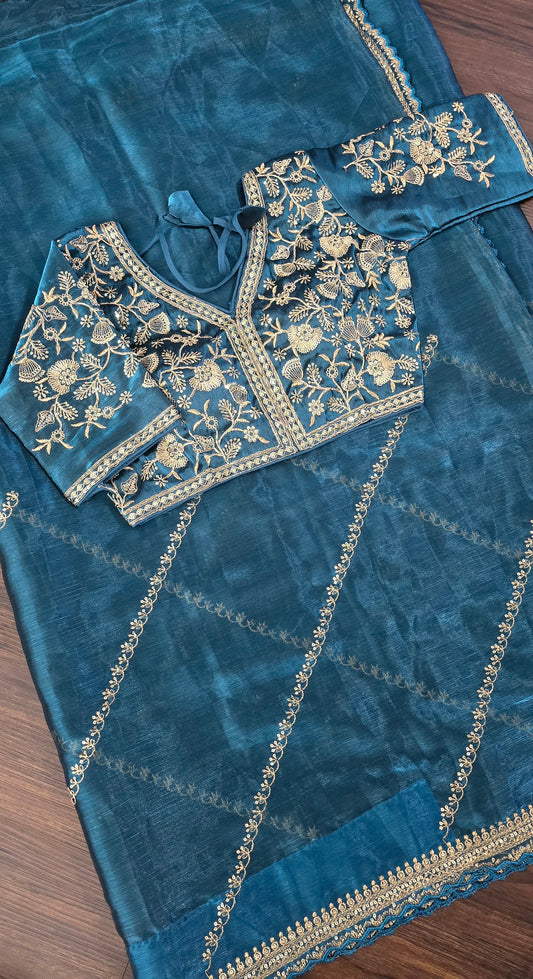 Jimmy Choo Fabric peacock Blue Saree with stitched work Blouse.