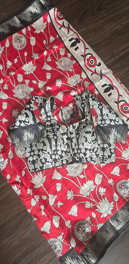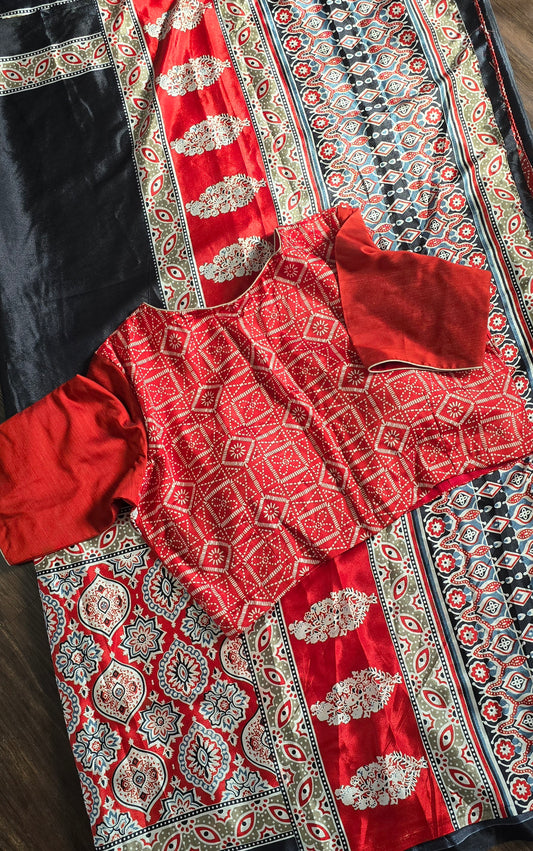 Ajrak print Crape silk saree with stitched Blouse. Black and red.