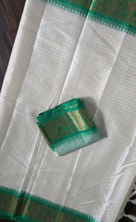 Cotton silk blend off white checks saree with zari weave contrast green border and with unstitched blouse piece.