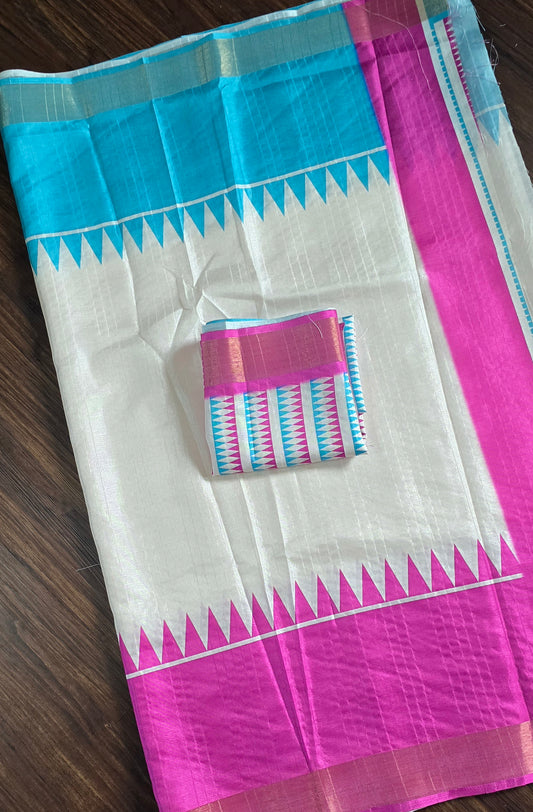 Semi tussar temple style Ganga jamuna border Saree with unstitched blouse. Sky blue and pink.