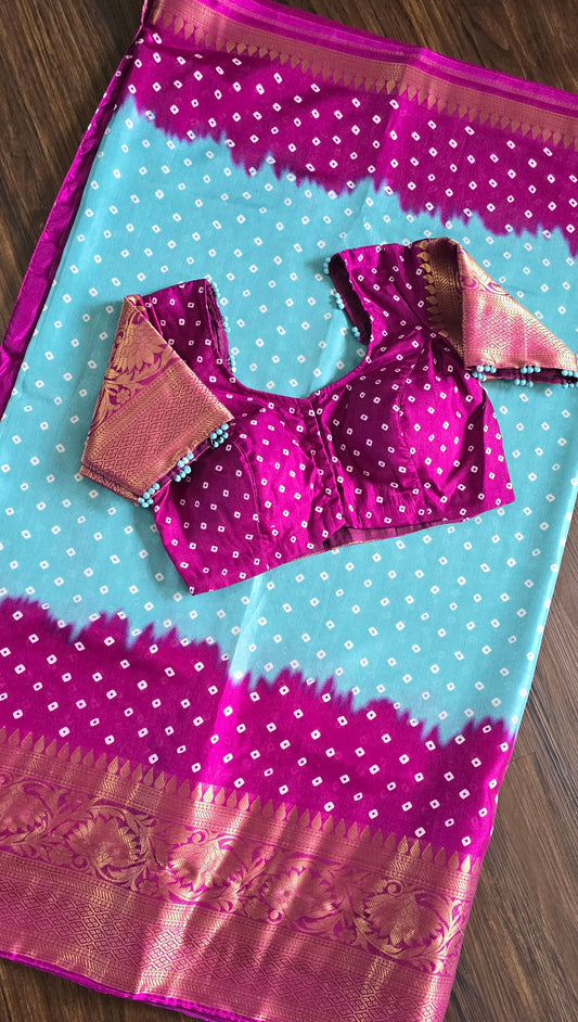 Bandhni PRINT soft Dola silk saree with stitched blouse. Sky blue and Majenta.
