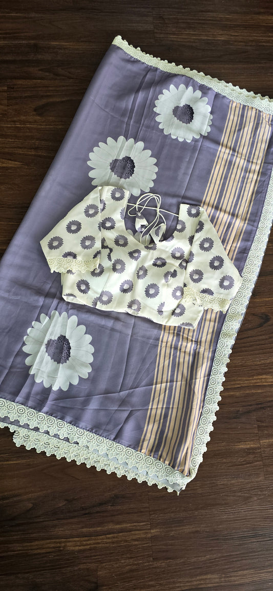 Premium soft and smooth gray Crape Silk Saree with sunflower print and stitched blouse.