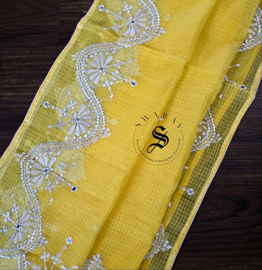 Kota mix cotton small mirror work saree with contrast stiched work blouse.