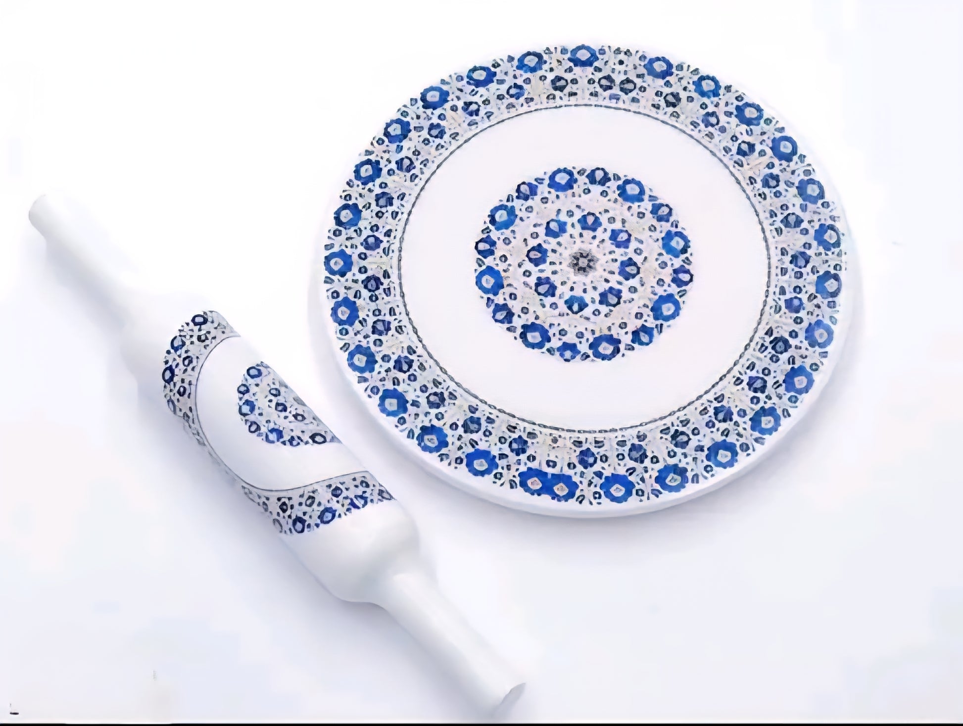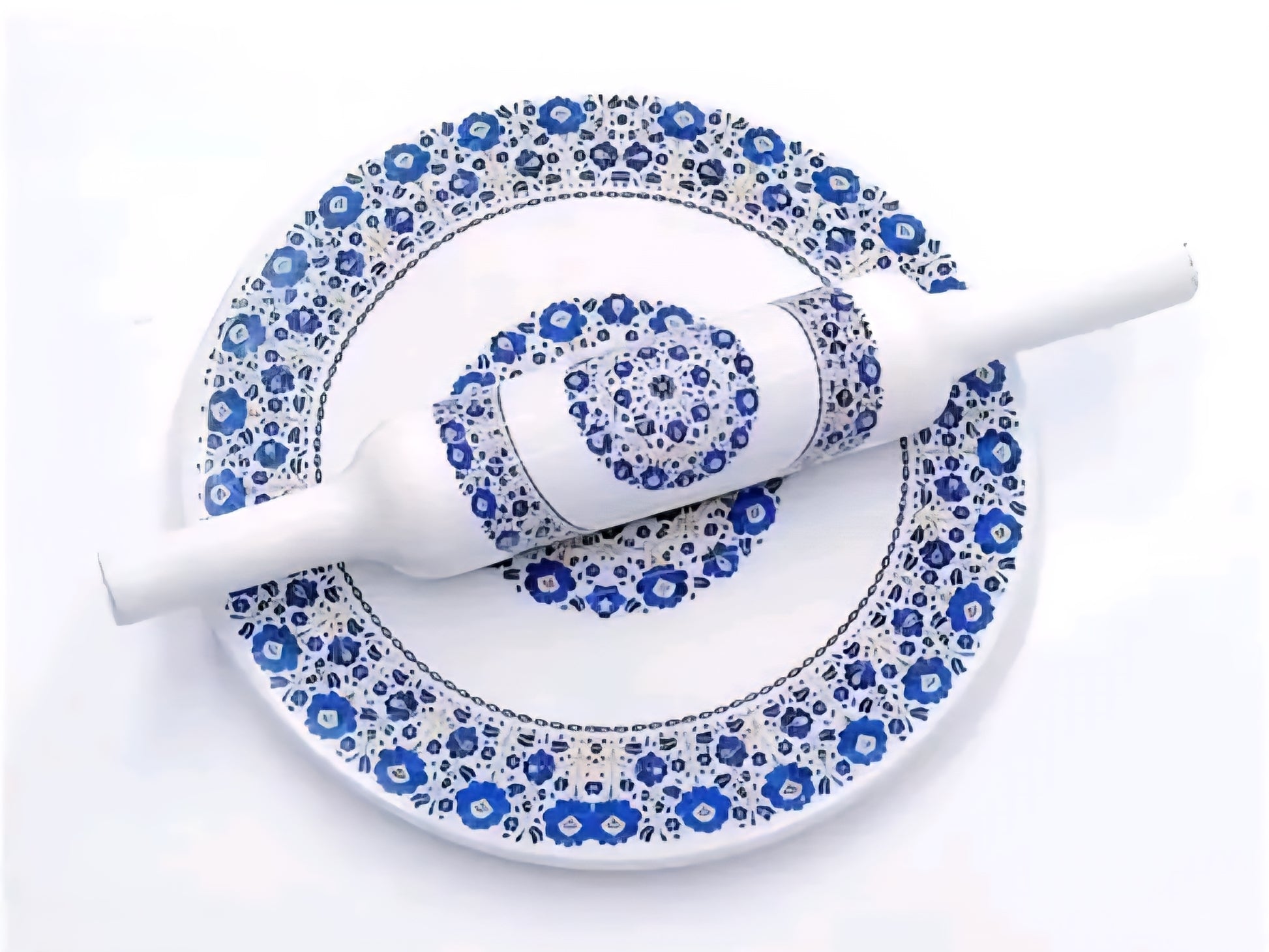 10 inch Marble Chakla Belan - with blue and white floral print.