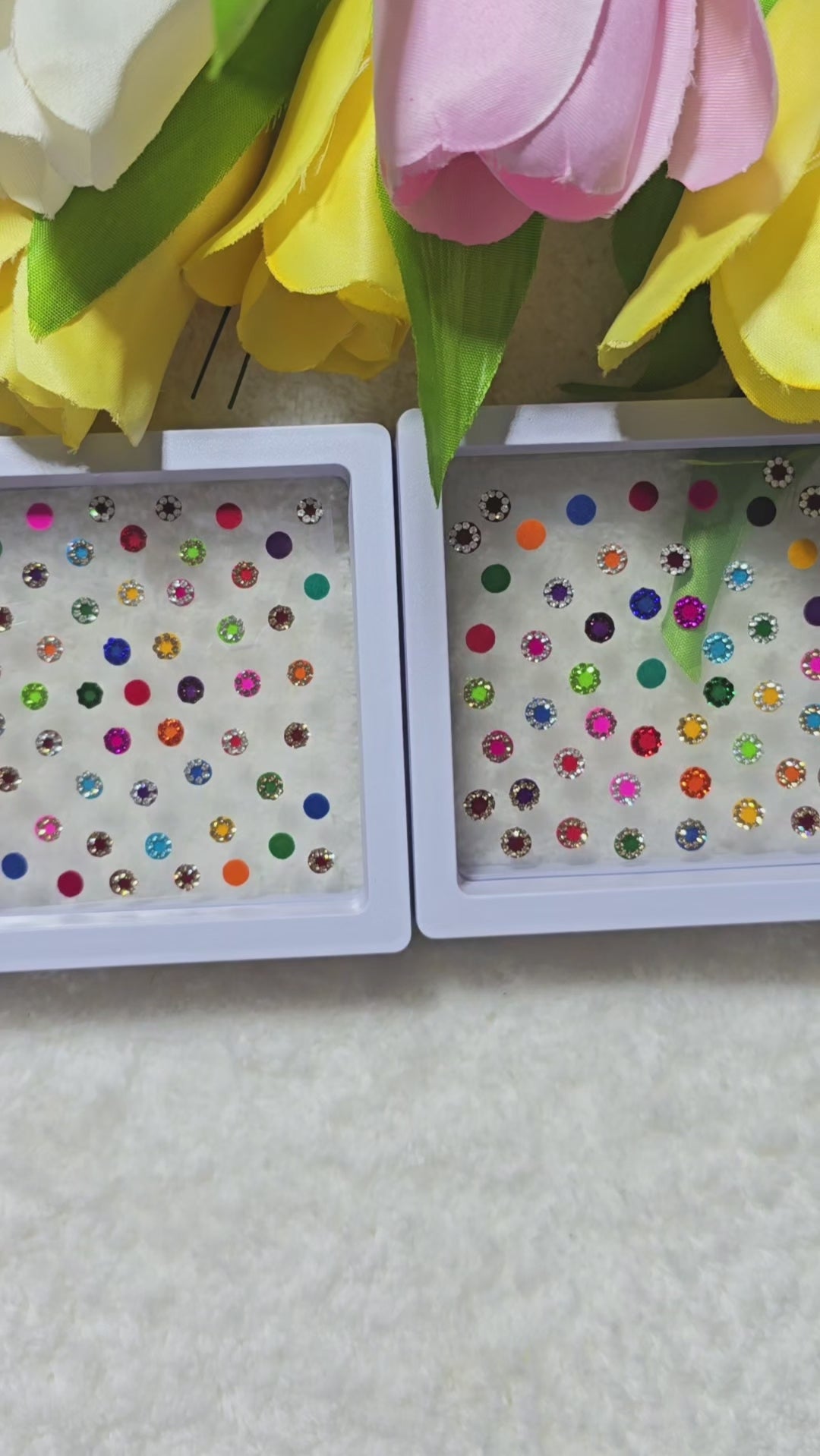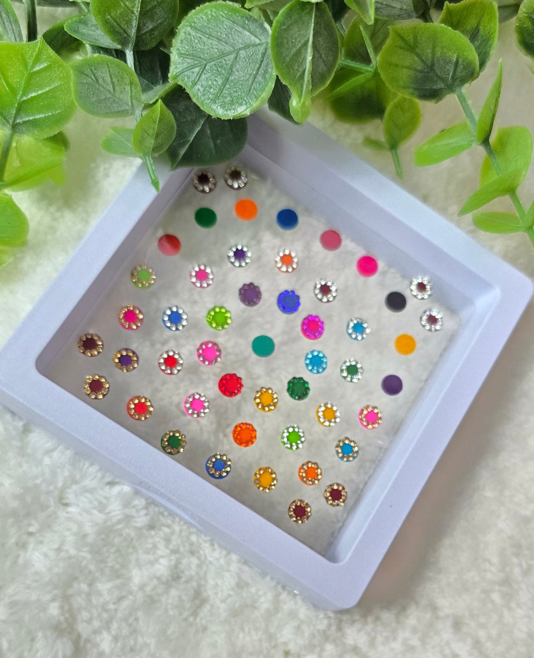 Introducing our 50 multi-colored and uniquely designed Bindi set, neatly packaged in a see-through box for easy organization and storage.