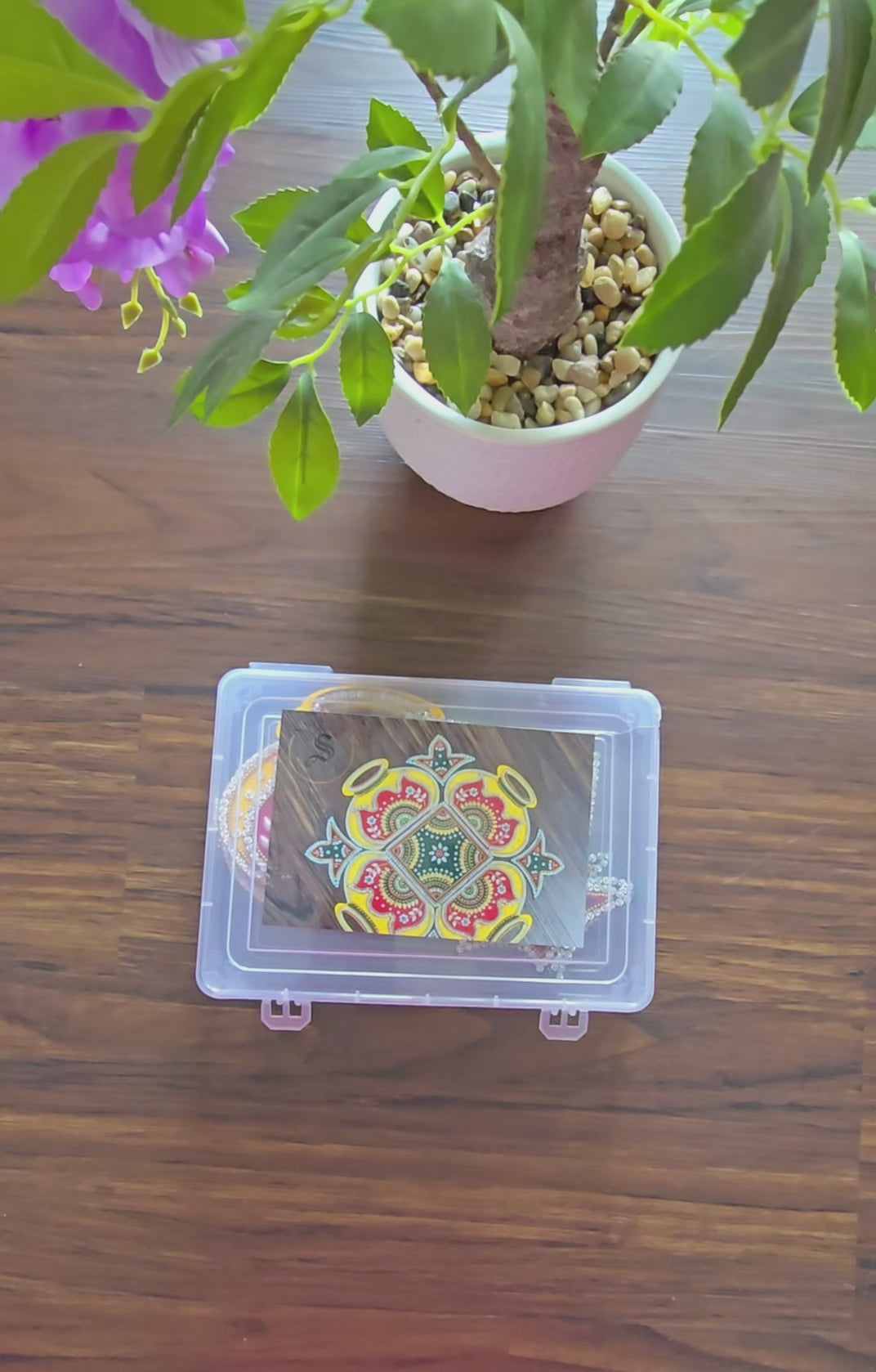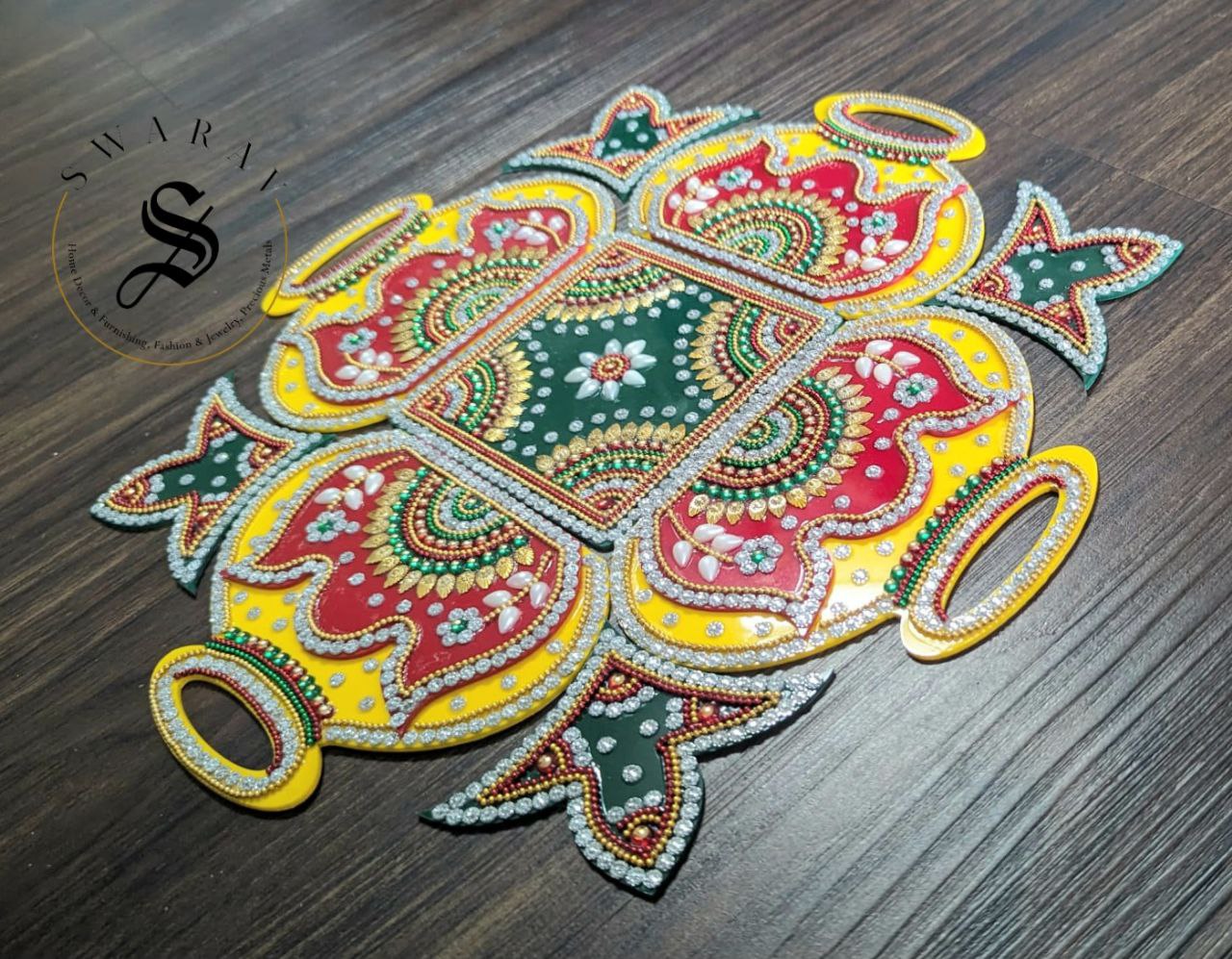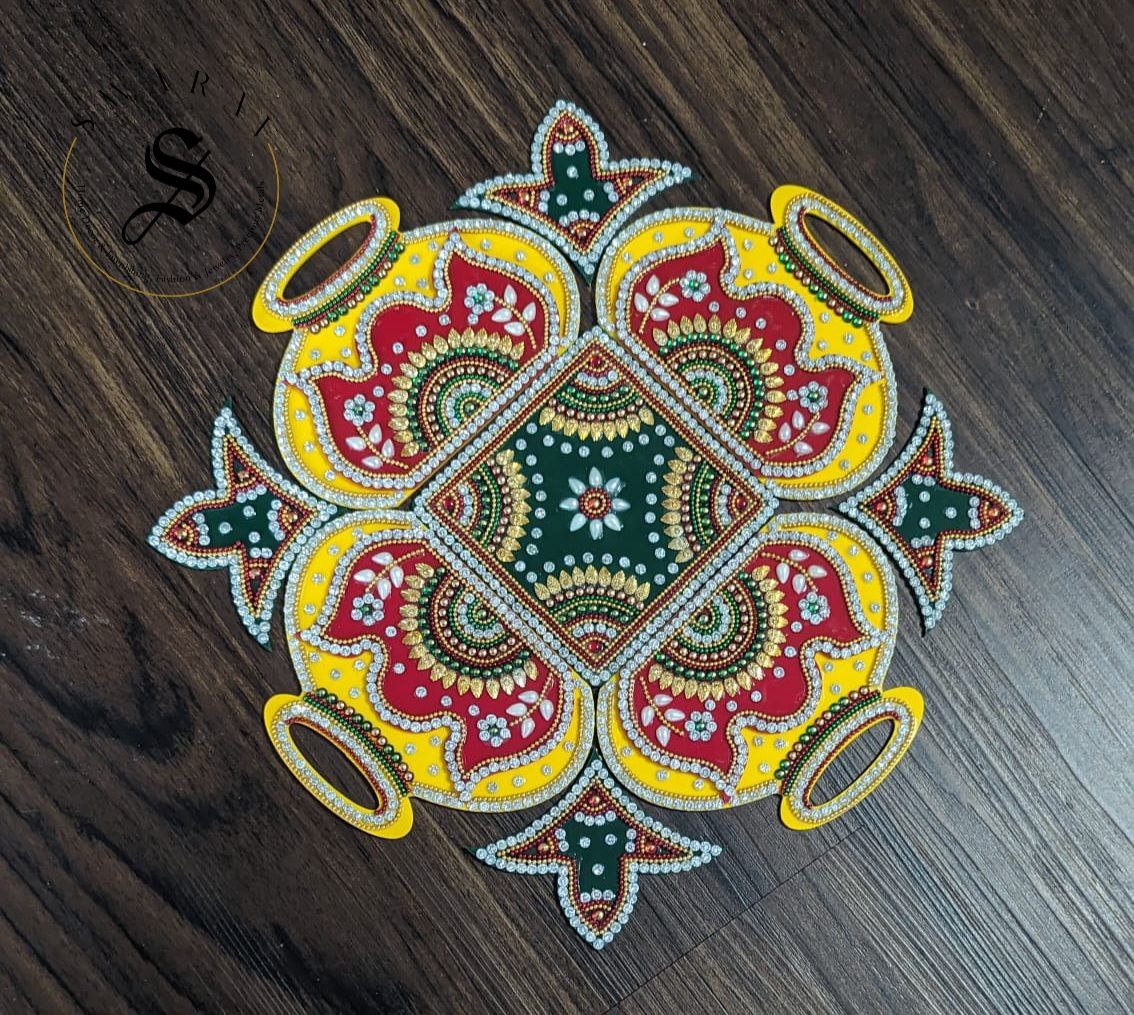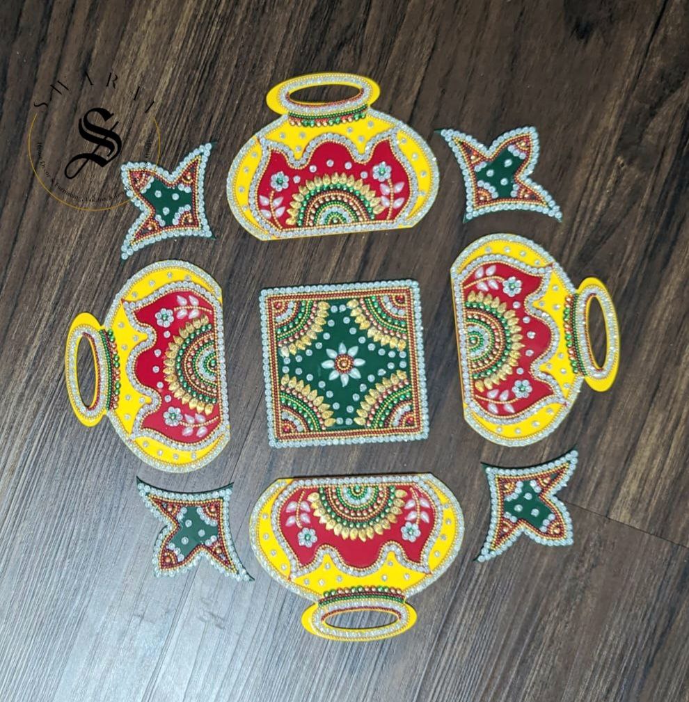 Bring home this beautiful vibrant festive special multi color, completely hand made Acrylic Rangoli set of 9 pieces to decorate your floor on special occasions.