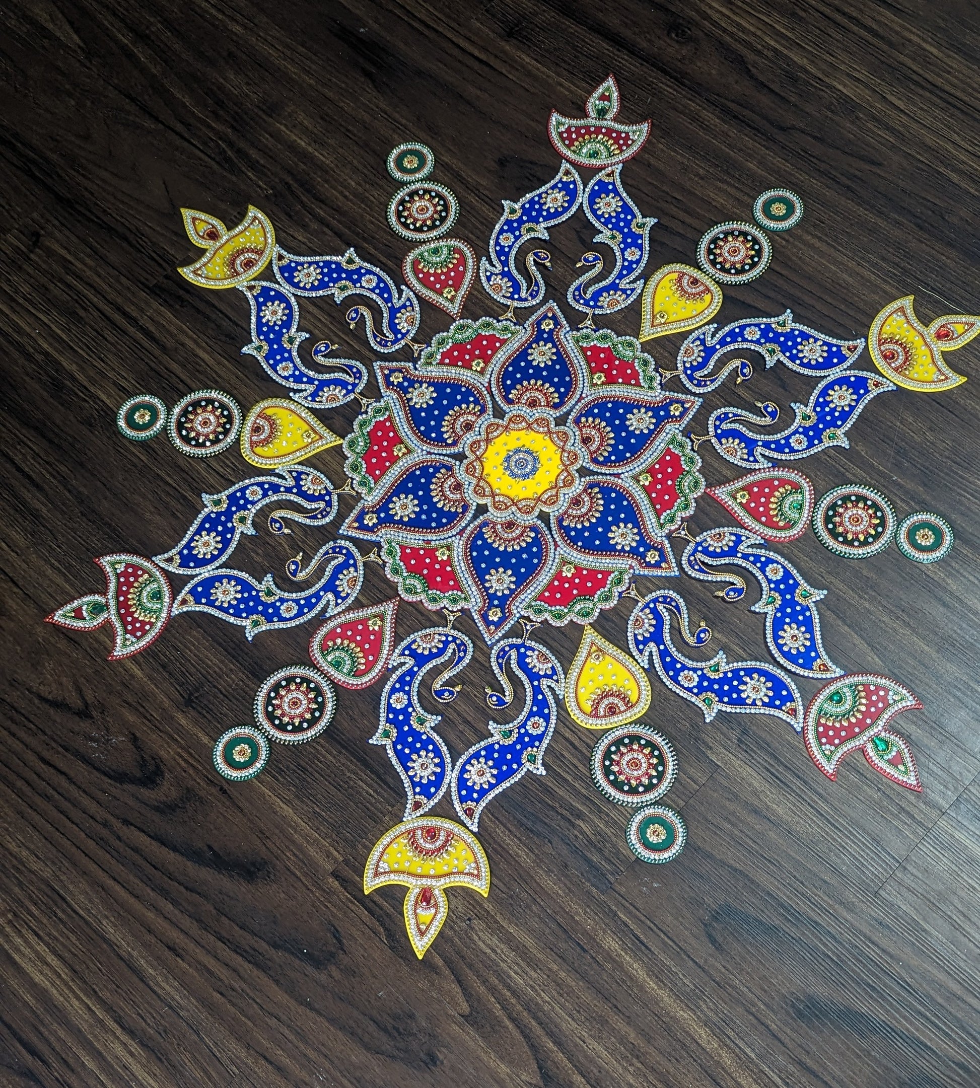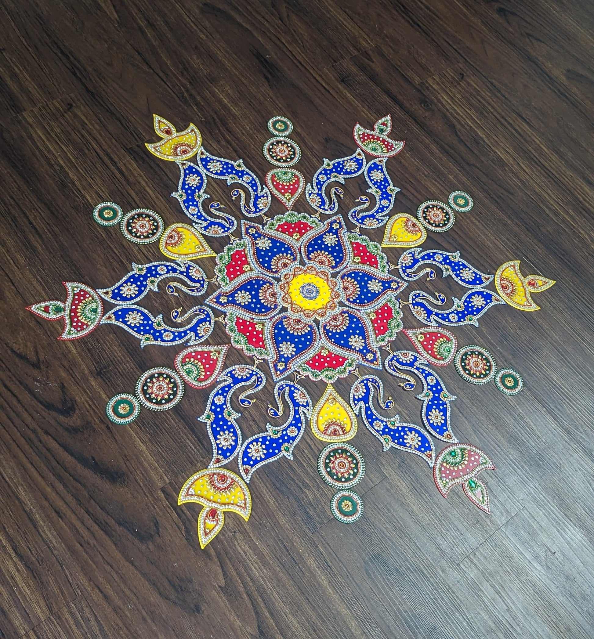 Bring home this beautiful vibrant festive special multi color, completely hand made Acrylic Rangoli set of 50 pieces to decorate your floor on special occasions.