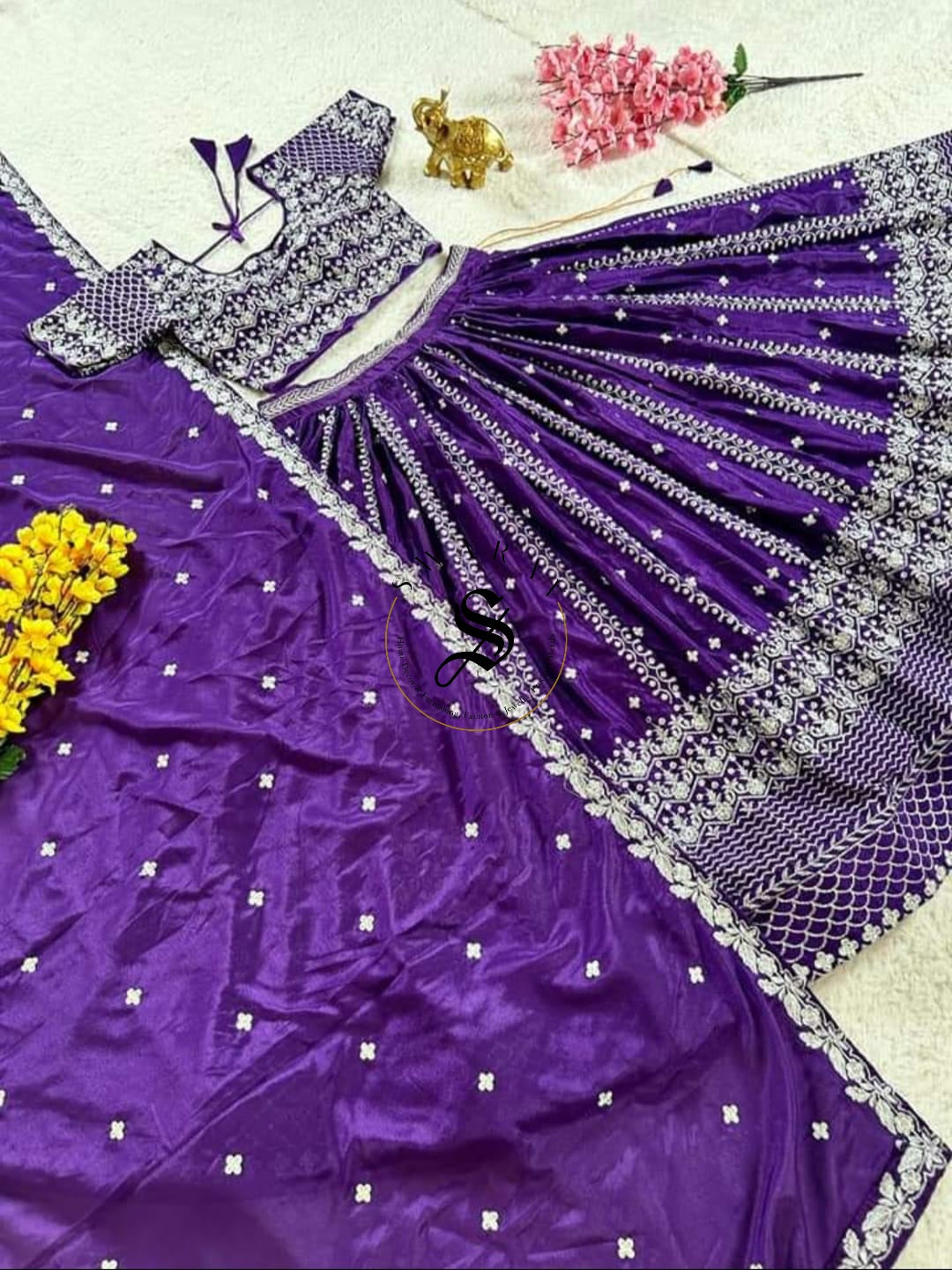*Soft Chinnon Silk with Designer Embroidered Butta-Work Lahenga with Rich Silver Embroidered Work on Daman*