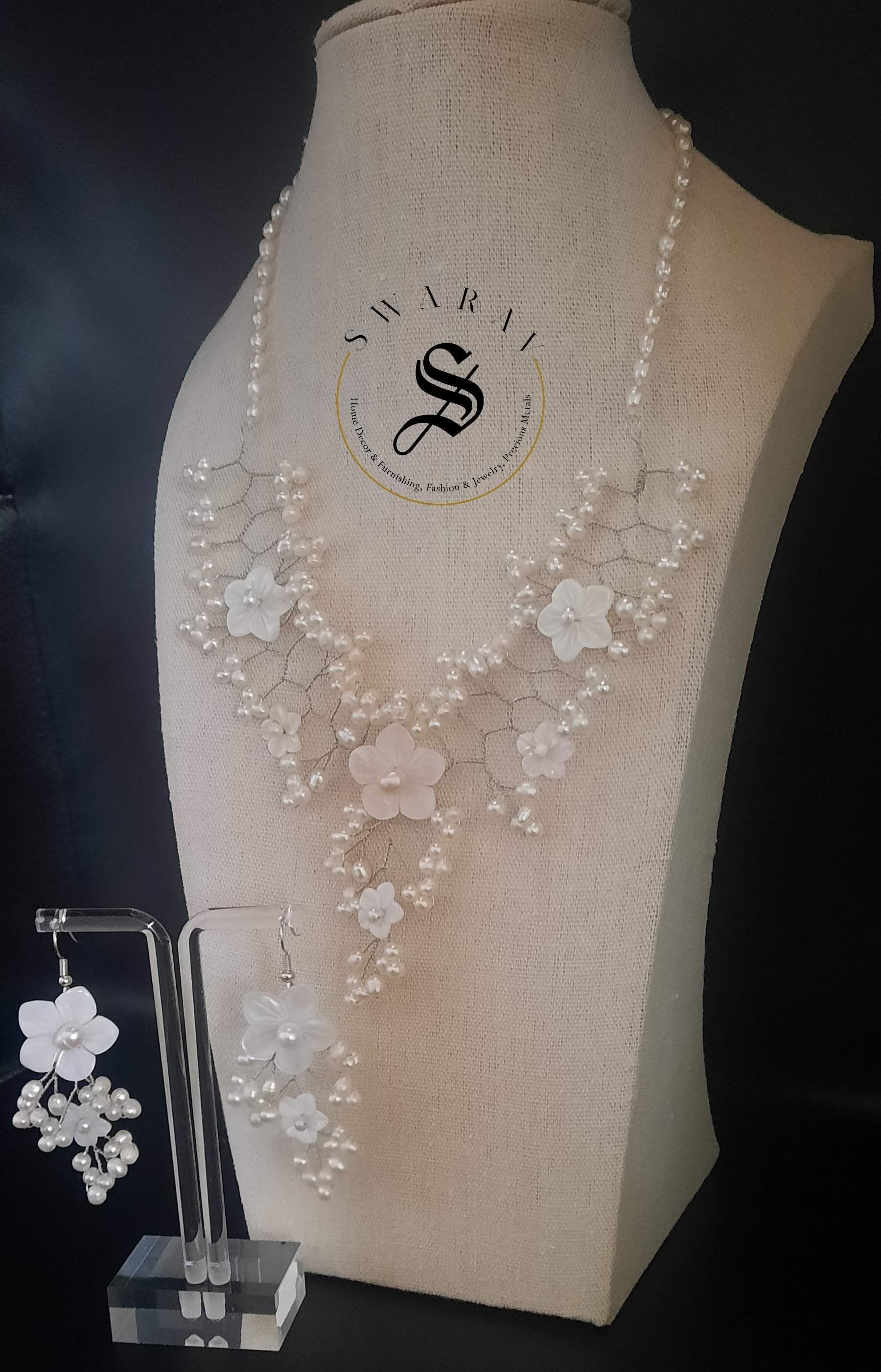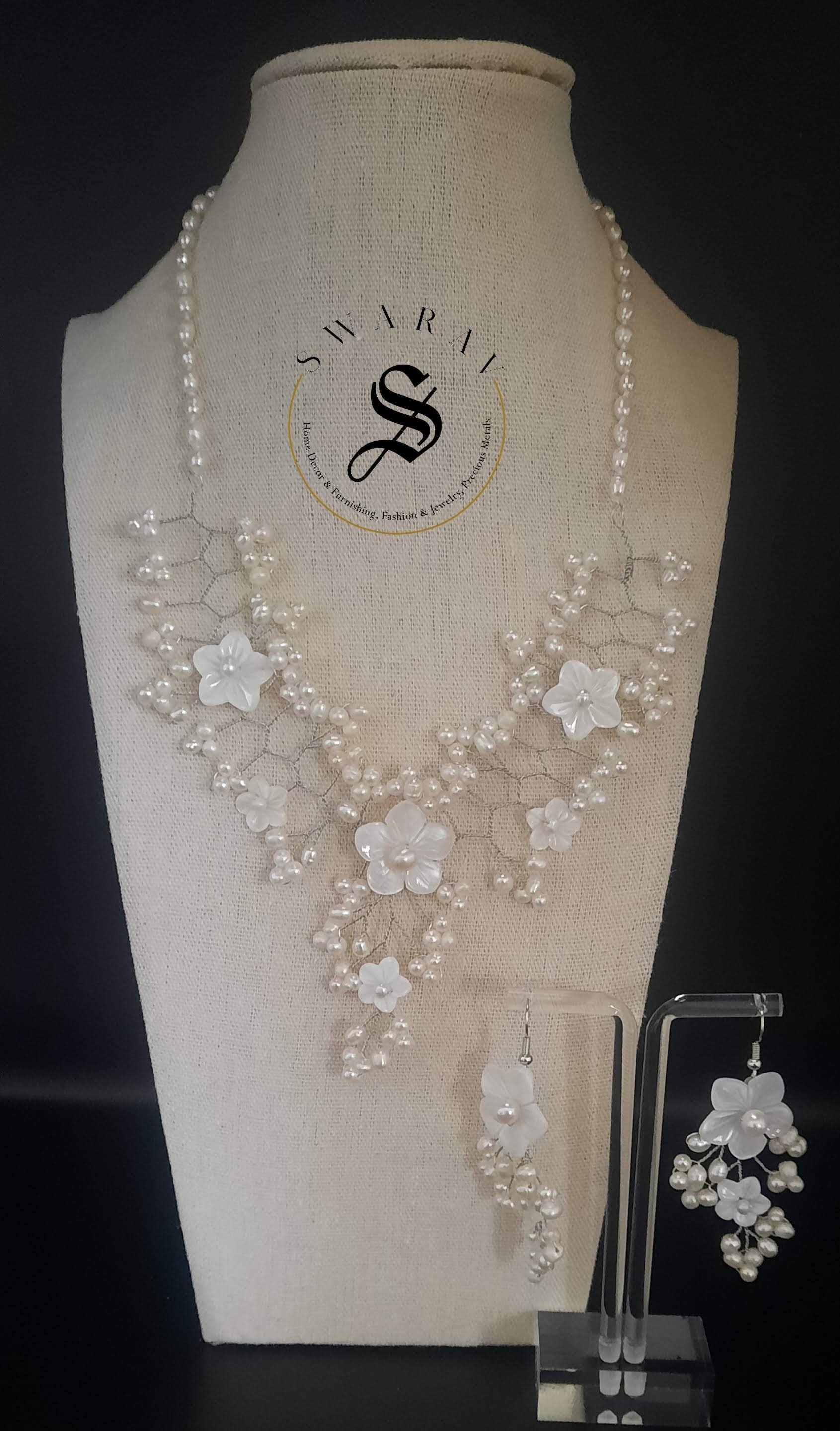 Beautiful and Trending Cultured fresh water pearl and Mop floral set in twining design with matching earrings.