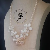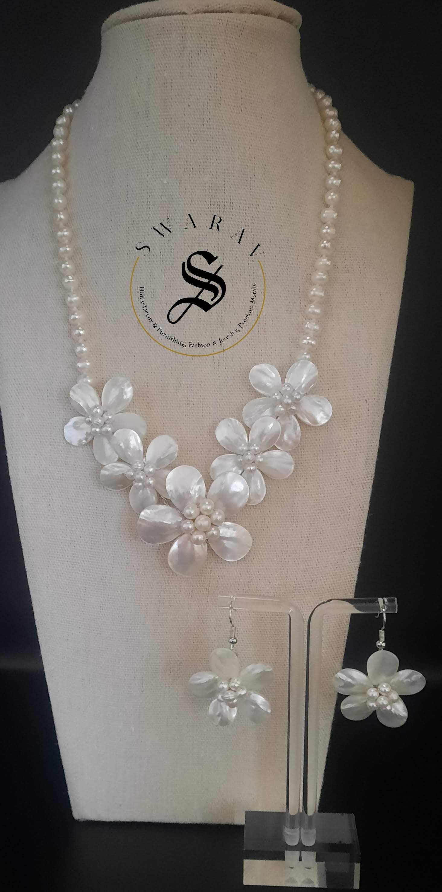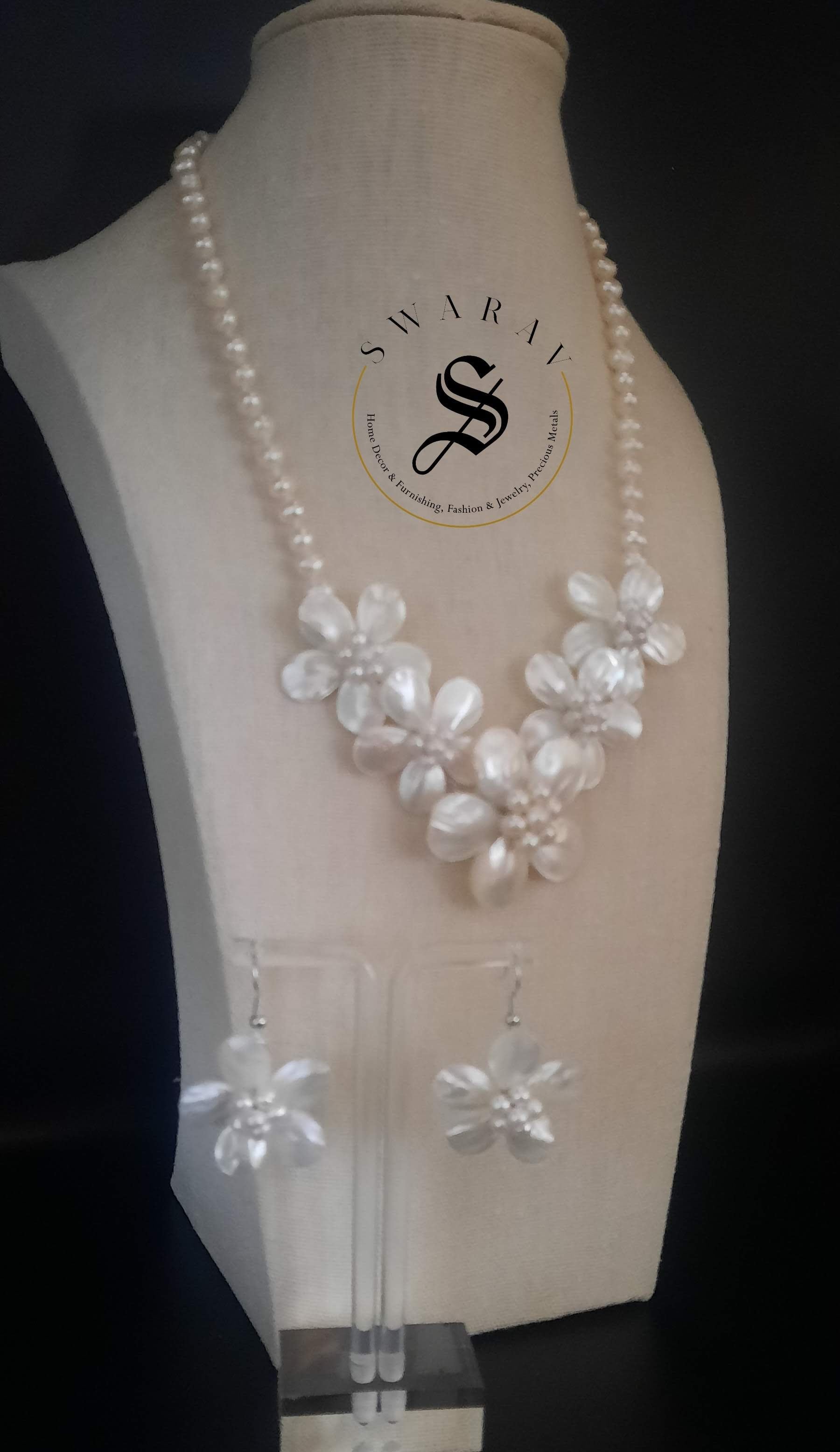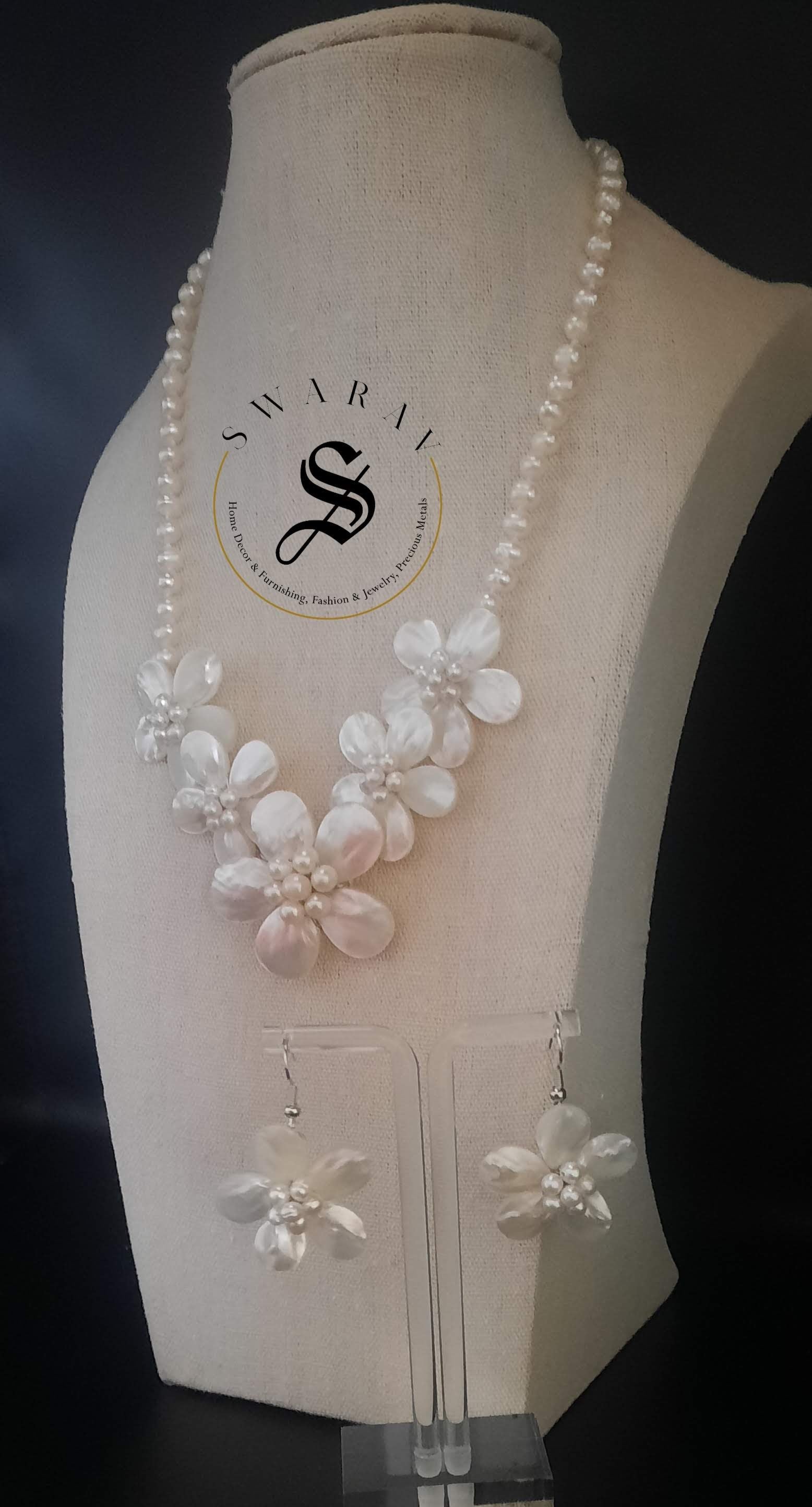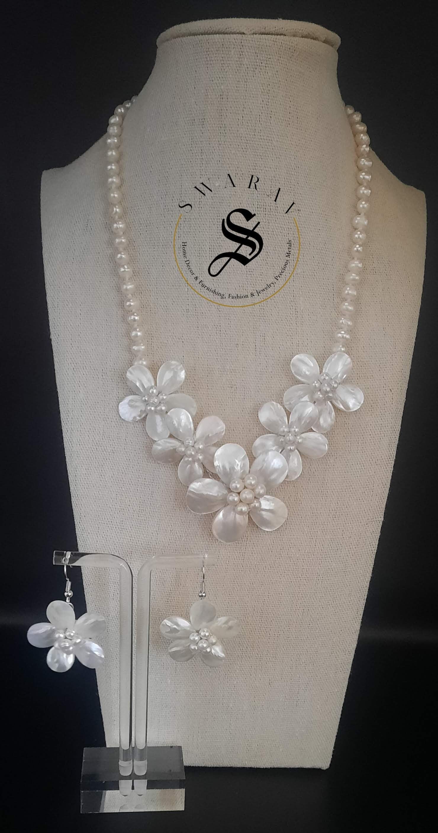Beautiful floral short Cultured pearl and MOP short necklace set with matching earring.