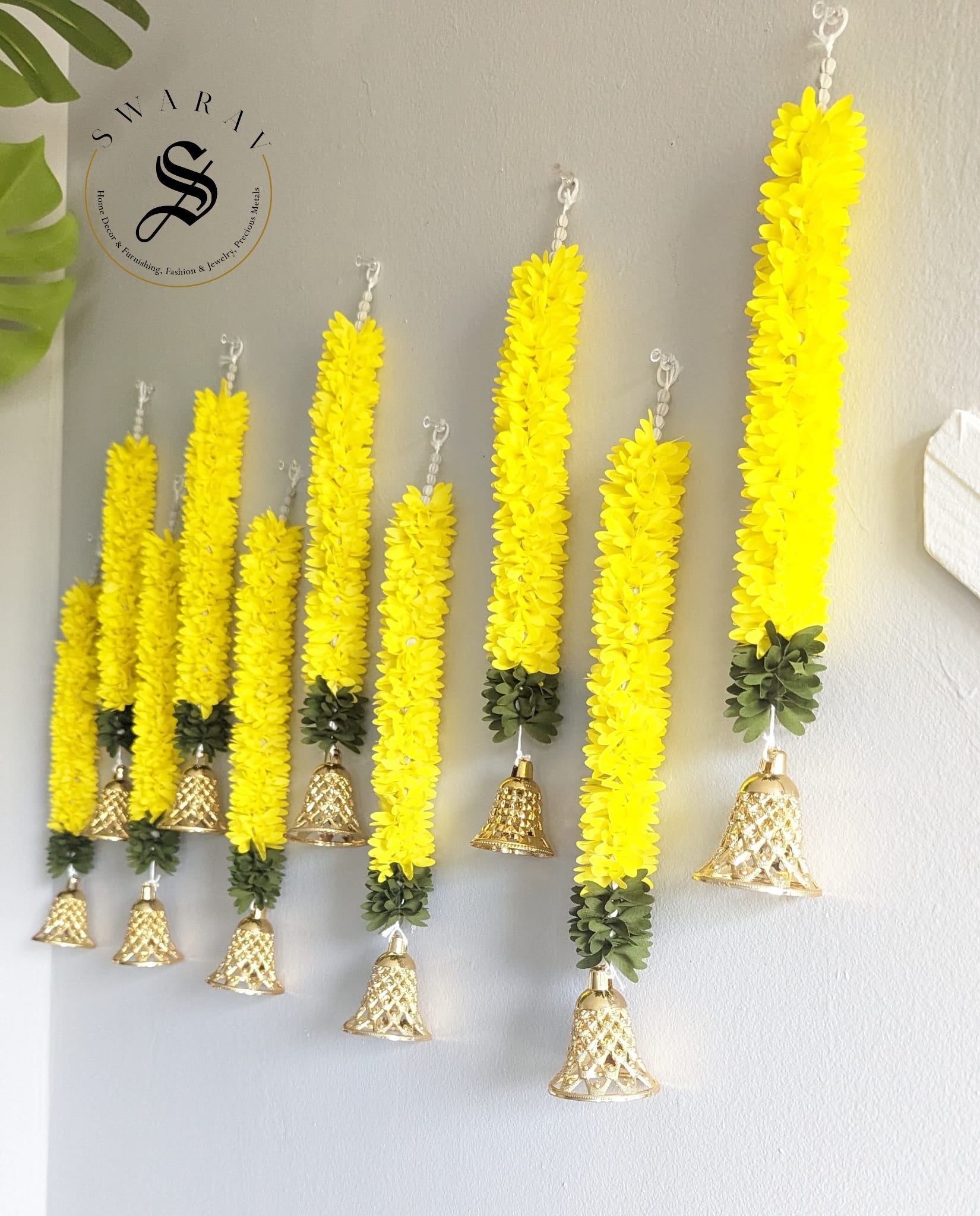 Fabric Flower Toran with Bell - Pack of 10 - Yellow.