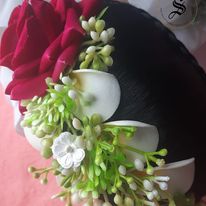 This Beautiful Hair Bun studded with red rose and an arch of artificial flowers, beads and leaves, intertwined in golden twig, makes it the most beautiful hair accessories that every women can wish for.