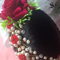 This Beautiful Hair Bun studded with red rose and an arch of artificial flowers, beads and leaves, intertwined in golden twig, makes it the most beautiful hair accessories that every women can wish for.