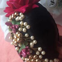 This Beautiful Hair Bun studded with red rose and an arch of artificial flowers, beads and leaves, intertwined in golden twig, makes it the most beautiful hair accessories that every women can wish for.
