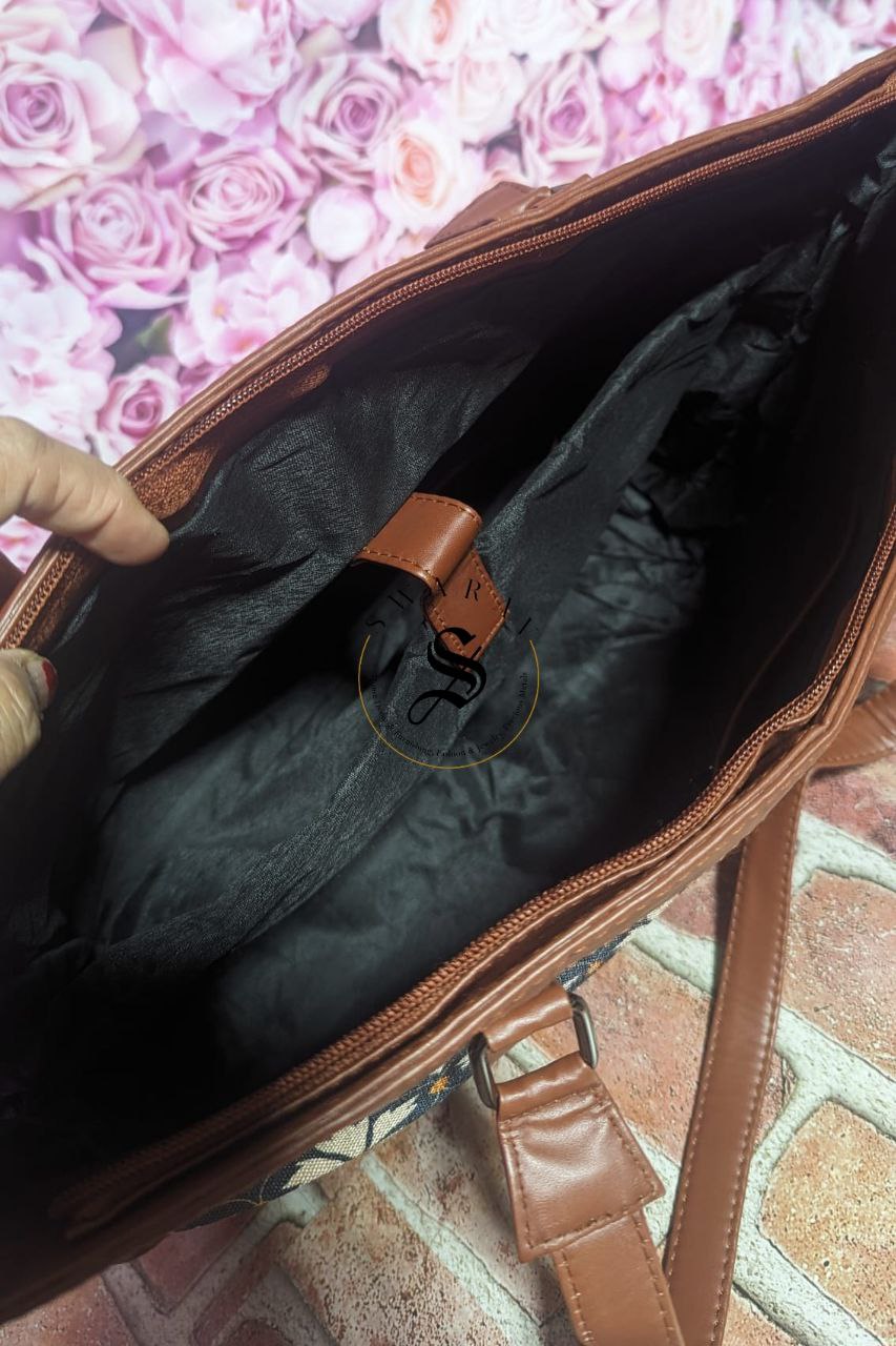 Make and Material : Made with high-quality multi color Floral design print fabric, with faux leather handles, base and borders all around in brown color.