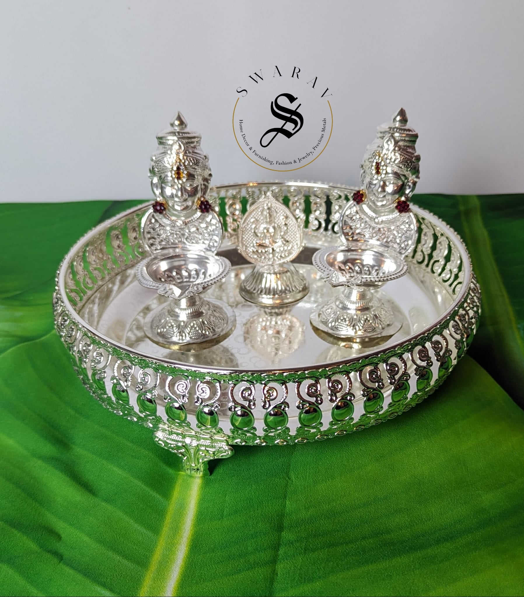 German Silver Combo pack of 3 items - 8 inch plate, Lakshmi Diya set of 2, with FREE incense stick Holder.