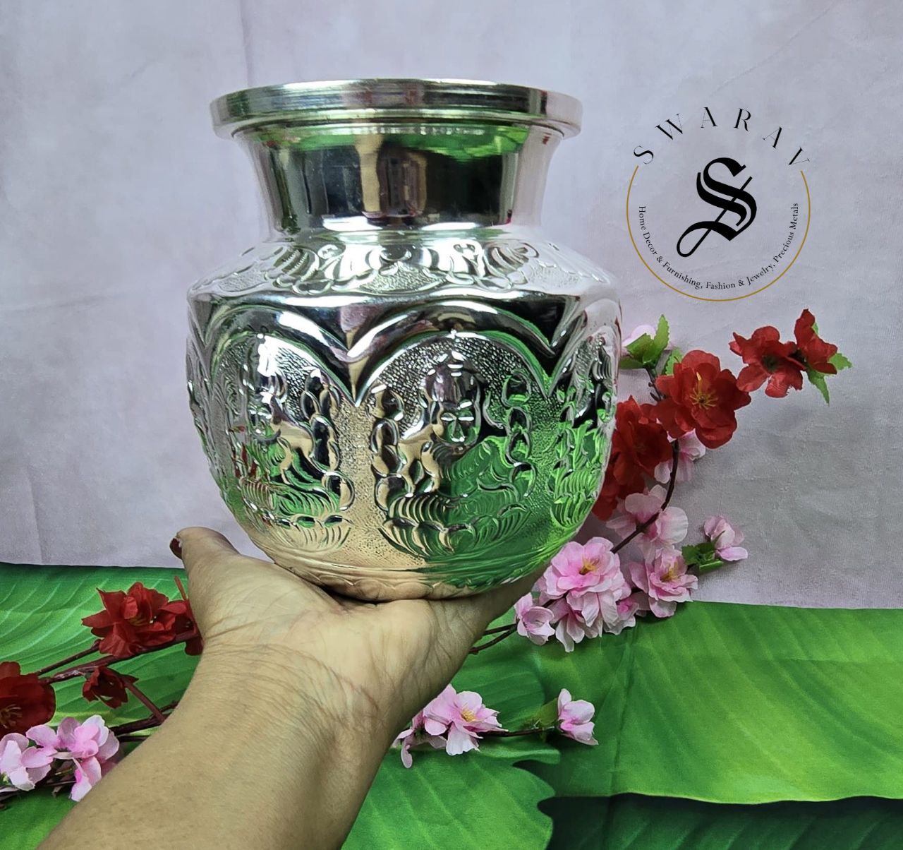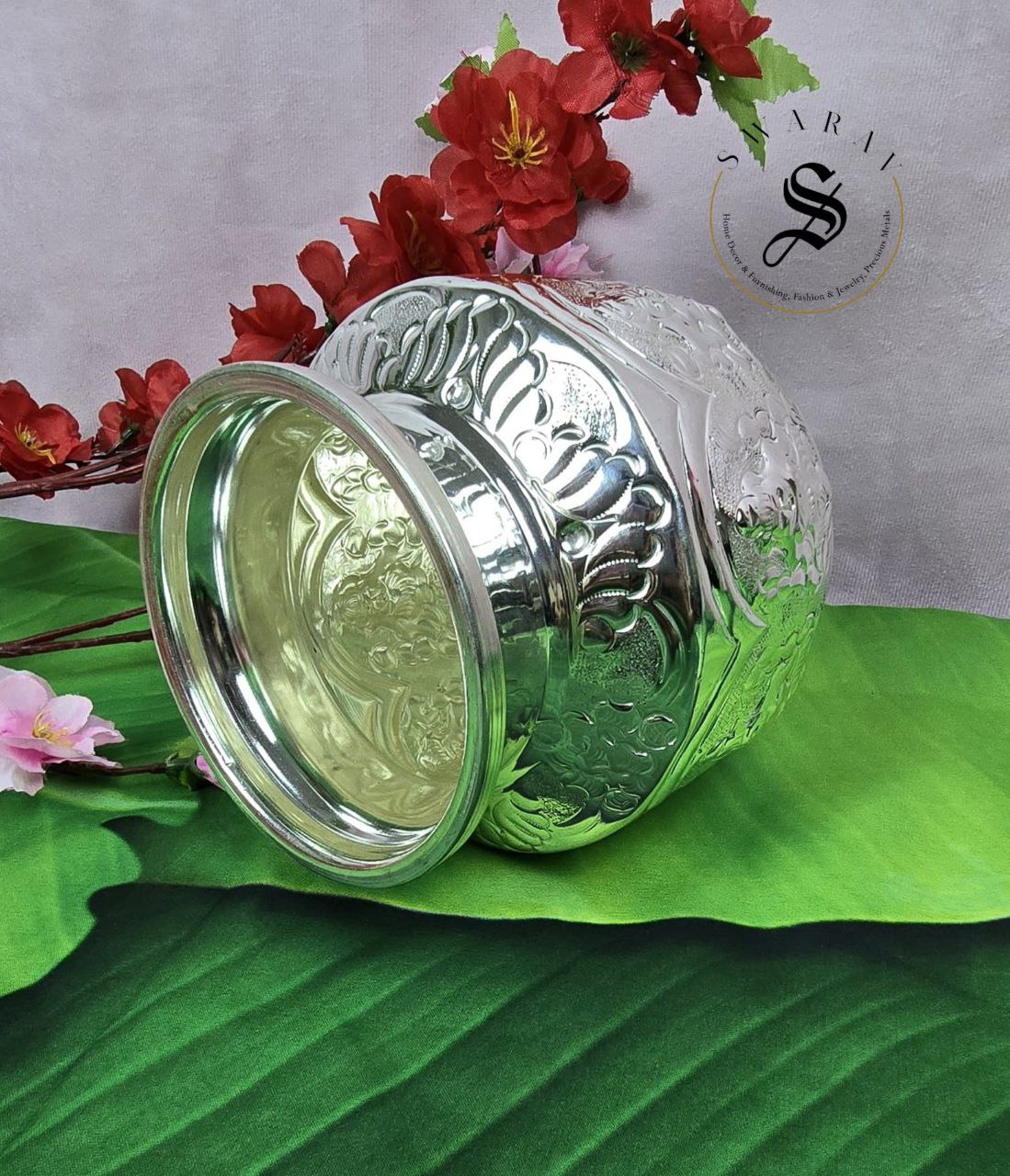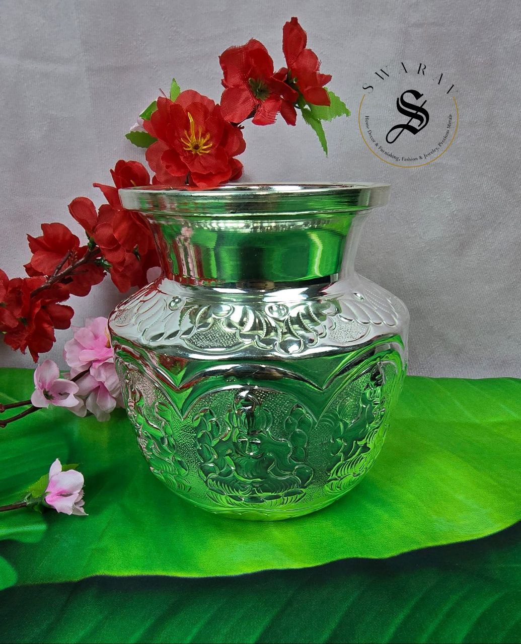 German Silver Lakshmi engraved Kalash. Size -6 inch.