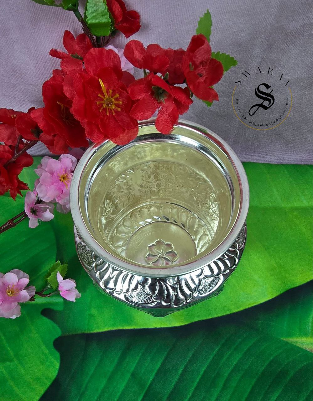 German silver, Lakshmi engraved Kalash for Pooja and festivities and for gifting under $100.