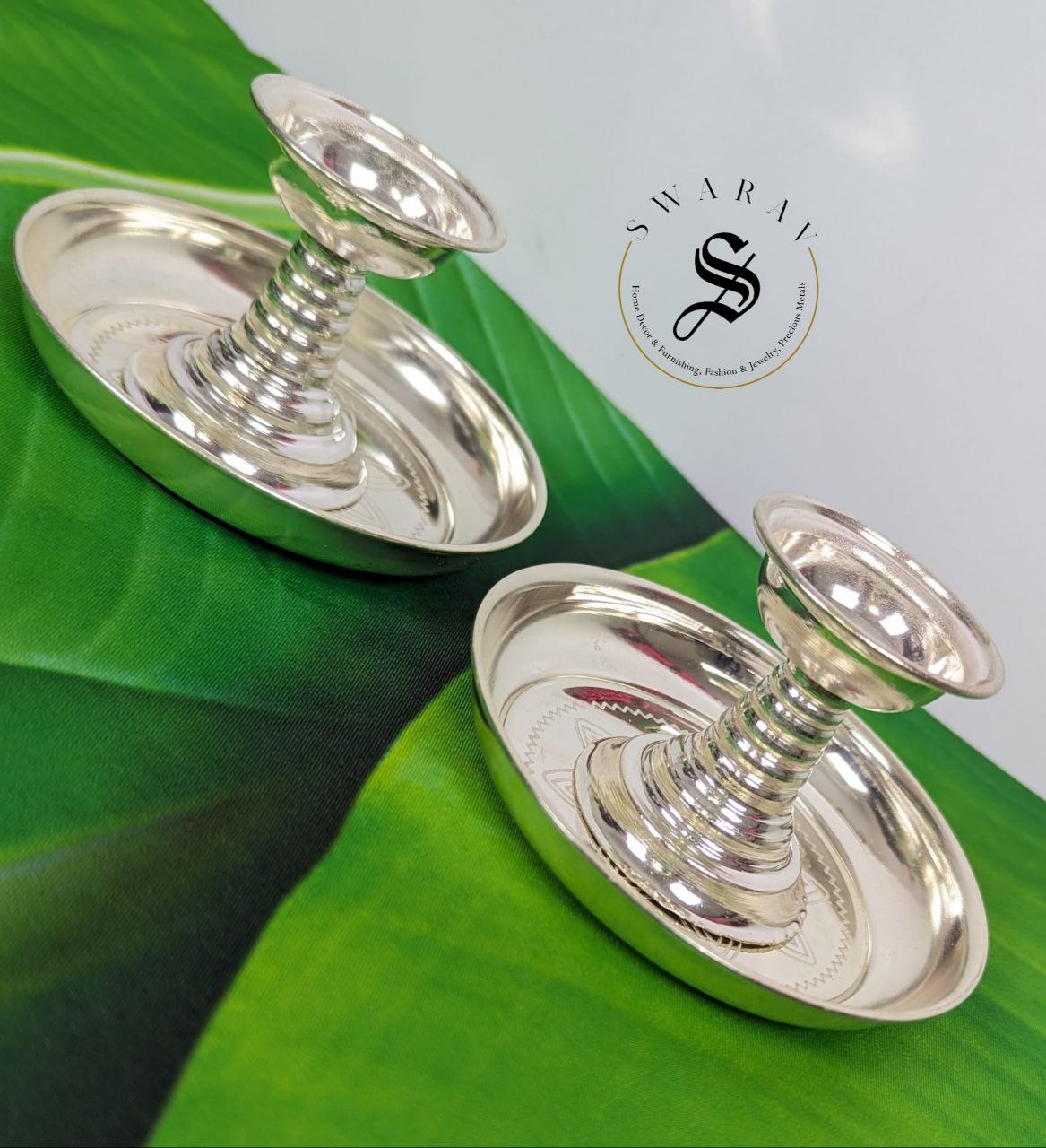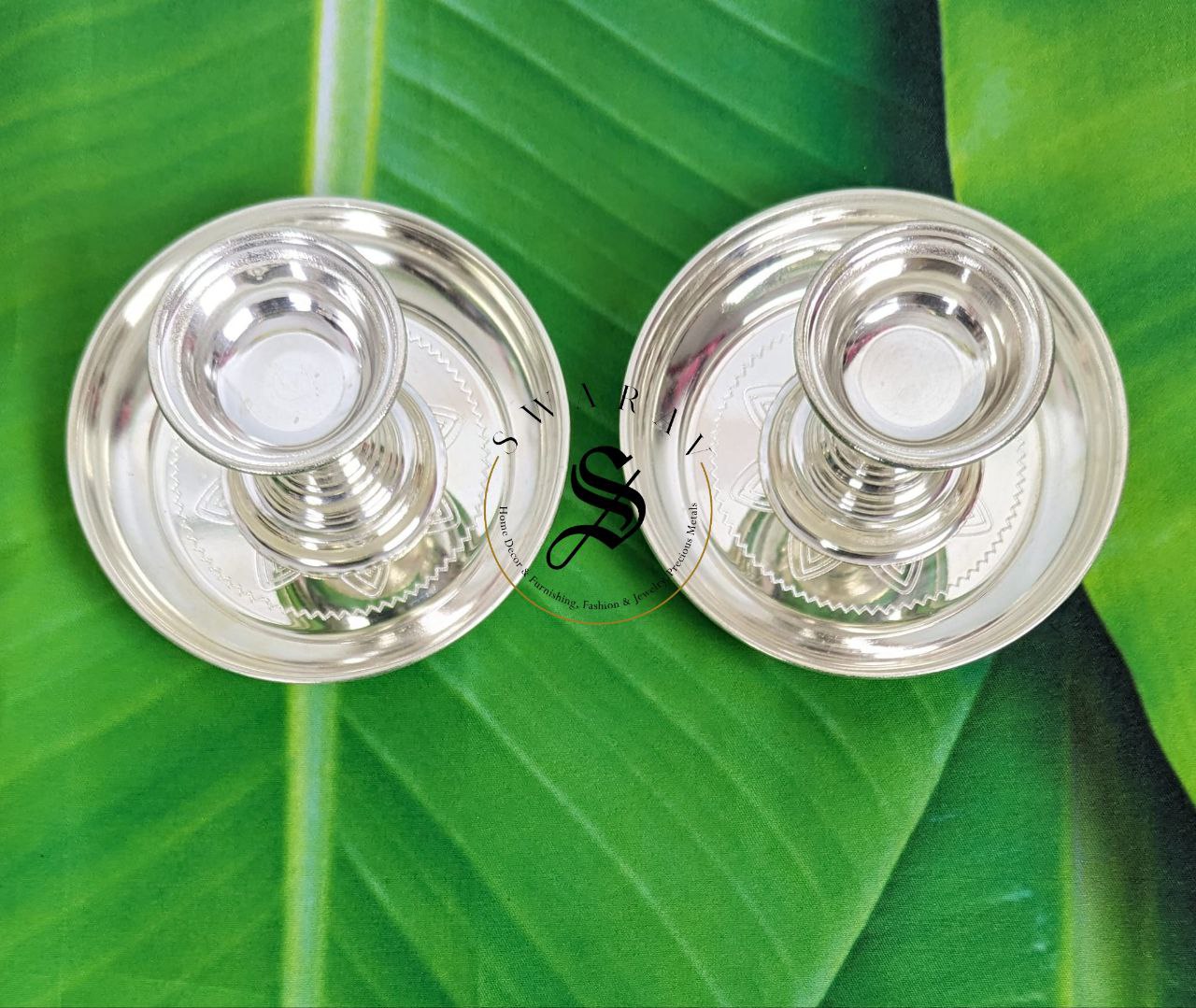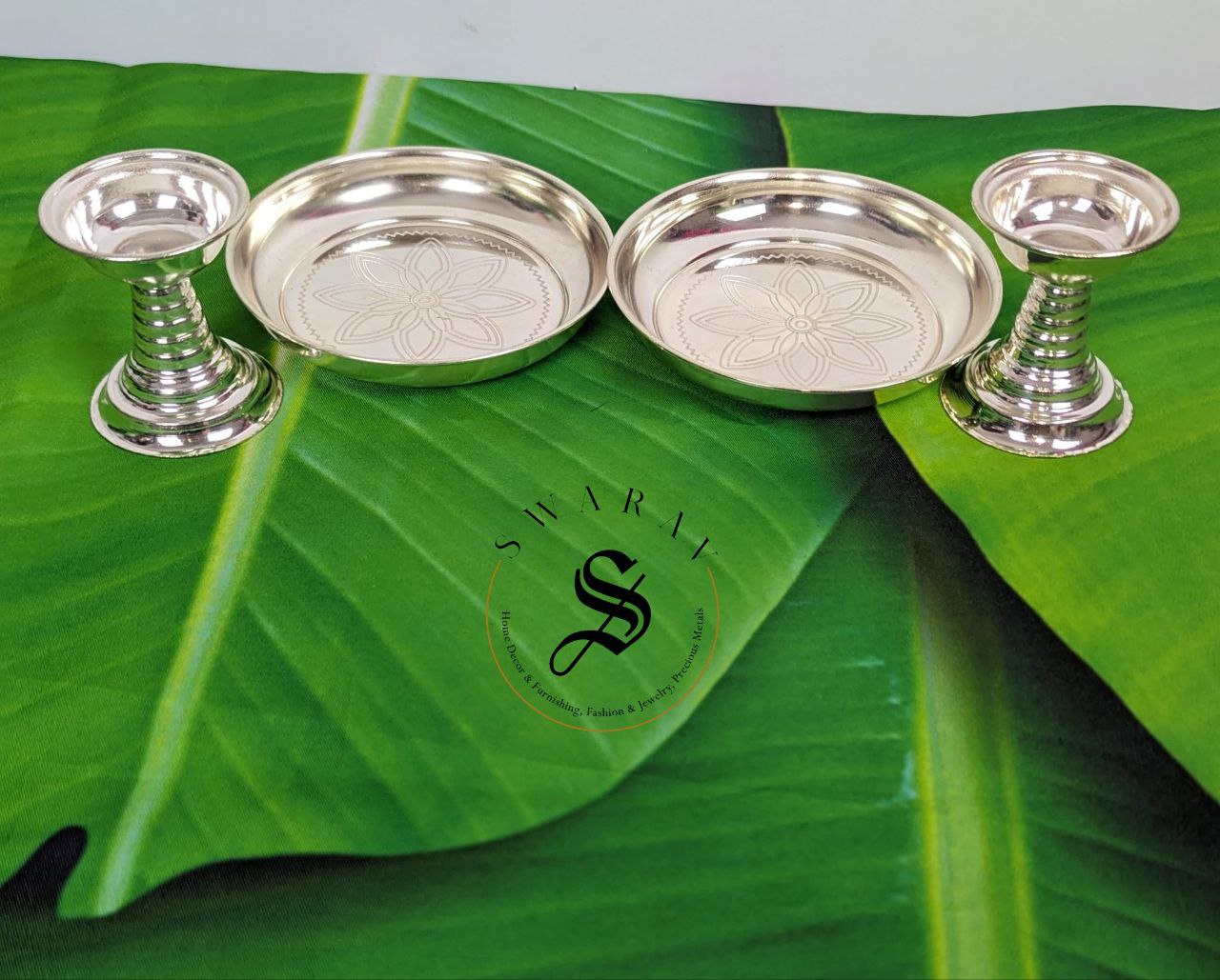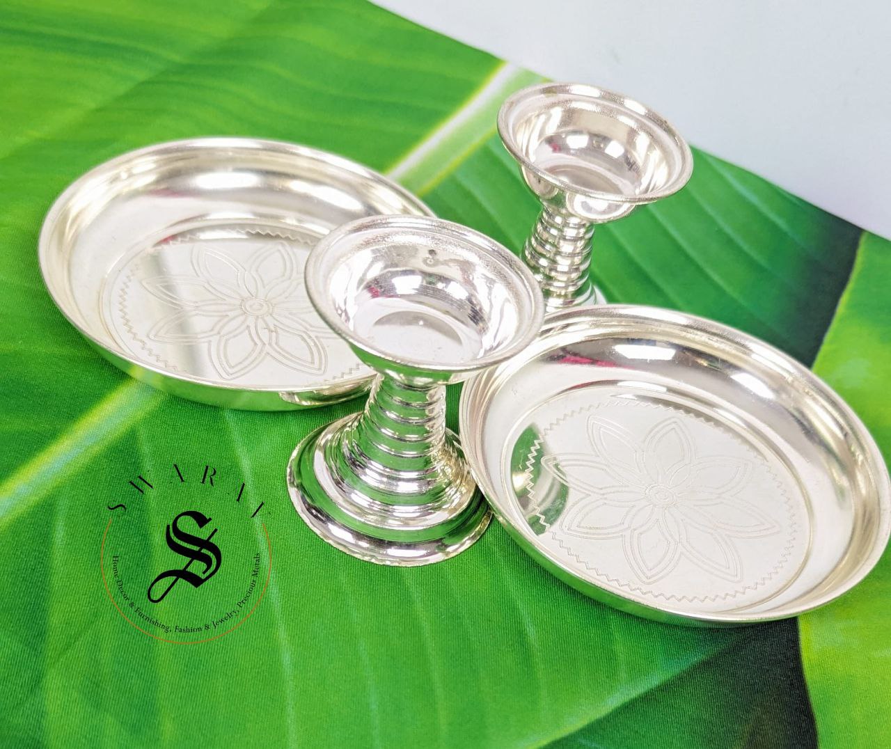 German silver Pillar Diya with plate, Set of 4 pieces / 2 Pairs which is look alike of pure silver, is the most affordable and attractive gifting option for occasions like religious festivals, House warming, wedding and a must have for religious rituals.